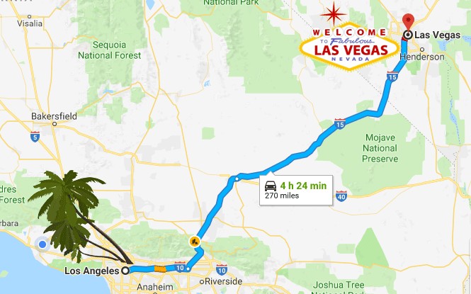 Driving is significantly slower than flying, with the average trip taking around 4 to 5 hours. However, just because it takes 5 times as long does not mean that driving to Vegas from LA is without its advantages. Taking a road trip from one city to the other allows you far more control over the experience. Depending on what route you take, you ll be able to enjoy a variety of attractions and sight-seeing opportunities such as Calico Ghost Town, Joshua Tree National Park, and the famed Route 66!