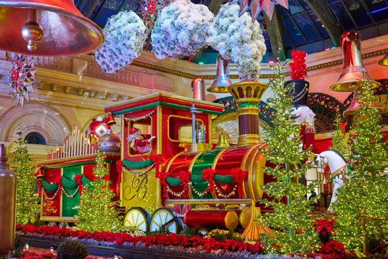 Brand new for 2025, the Bellagio Express takes center stage in the East Bed. Conducted by Elvie the Elf, the locomotive carries oversized ornaments and gifts along a walkable path that winds directly through the train itself, offering a playful up-close experience.