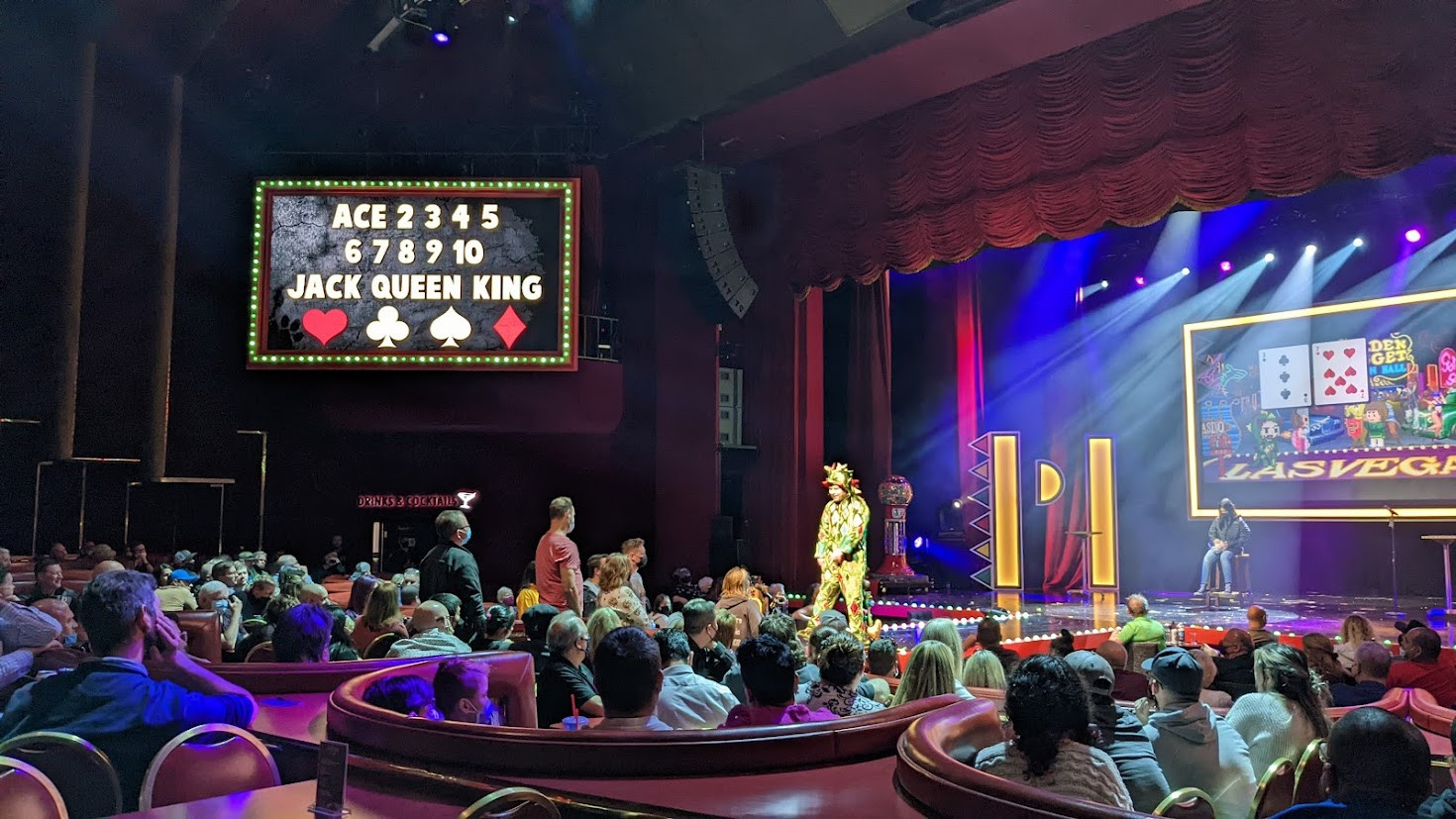Piff and company recently moved from the intimate Bugsy's Cabaret to Flamingo's main showroom. That grand dame was once home to Donny & Marie and Olivia Newton-John. Vintage-style booths and long narrow tables are a mixed bag, but the classic vibe of this historic room cannot be denied. It's wide, relatively spacious, and very easy to locate off the north side of the casino floor.