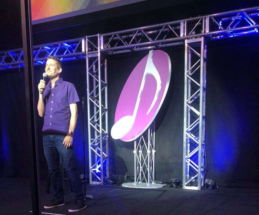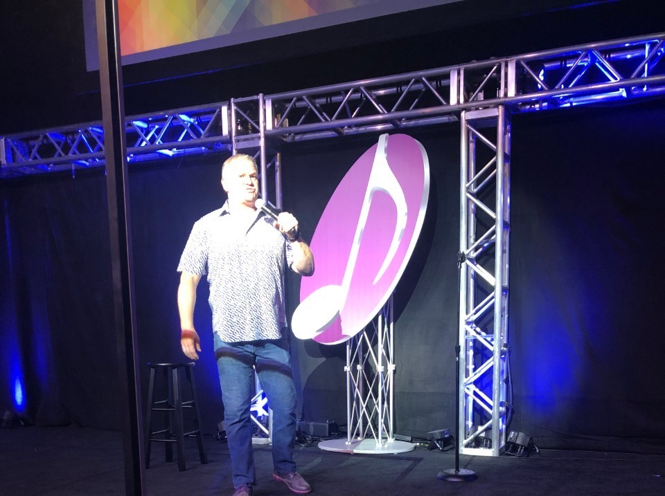 The interior reminds me of a swanky lounge. Soft purple lighting, socially distanced tables. A cocktail waitress slinking through the room. I’m waiting for my first drink when John Hilder bounds on a stage. He’s the show’s host and opening comedian.