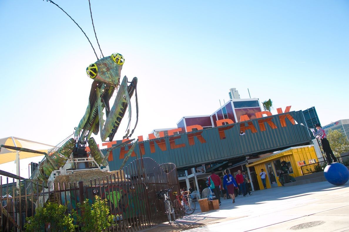 The fire-breathing praying mantis mounted outside Downtown Container Park. Downtown Container Park is an open-air shopping center majorly assembled from shipping containers. If you are going to get a costume from this inspiration, make sure you install the raptorial legs.