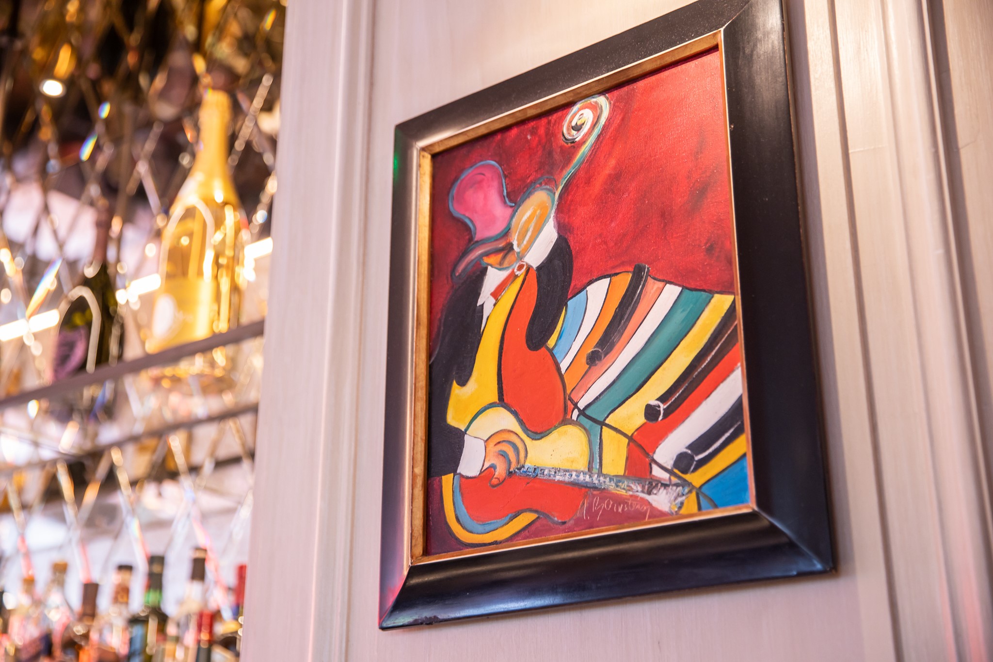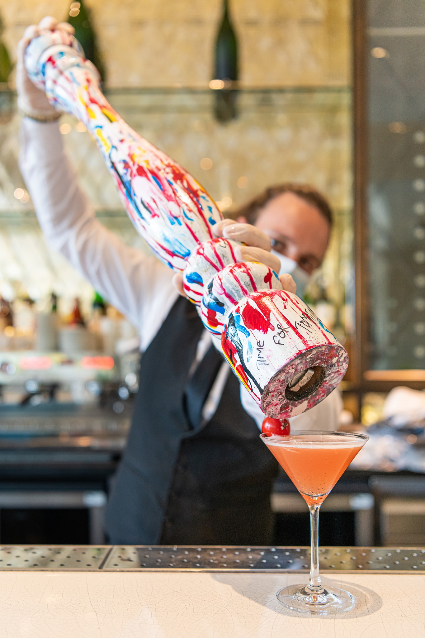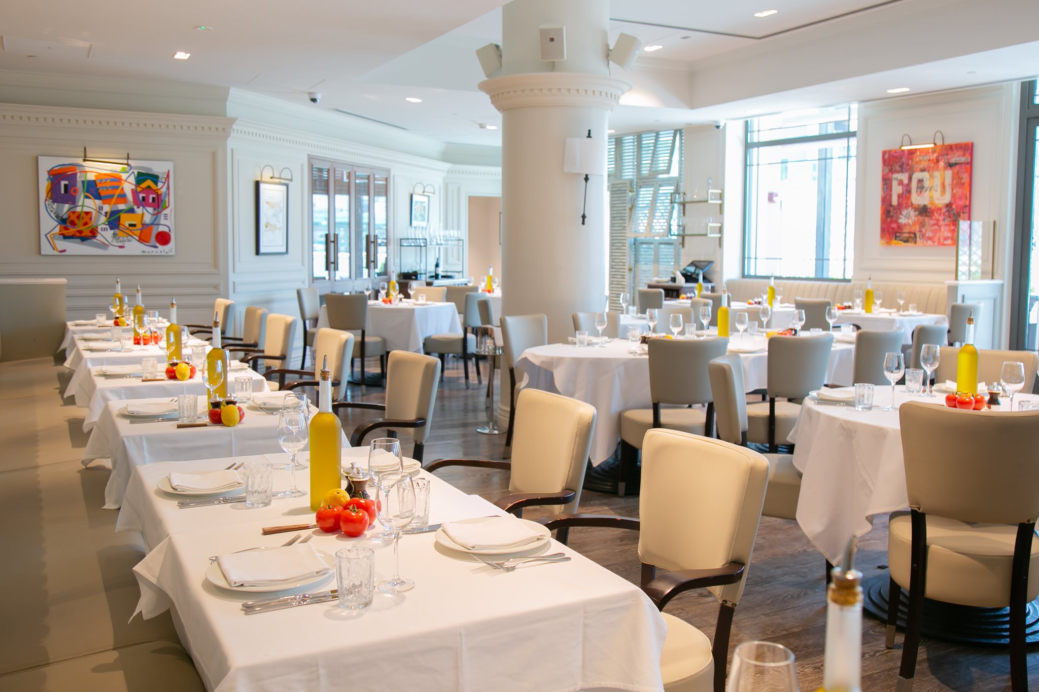 The restaurant's interior is painted white with bright colors and a pale marble effect on the walls. It’s also broken up with murals, paint splatters, and super vivid art prints. The lights are turned down in the evenings, and the music is turned up.