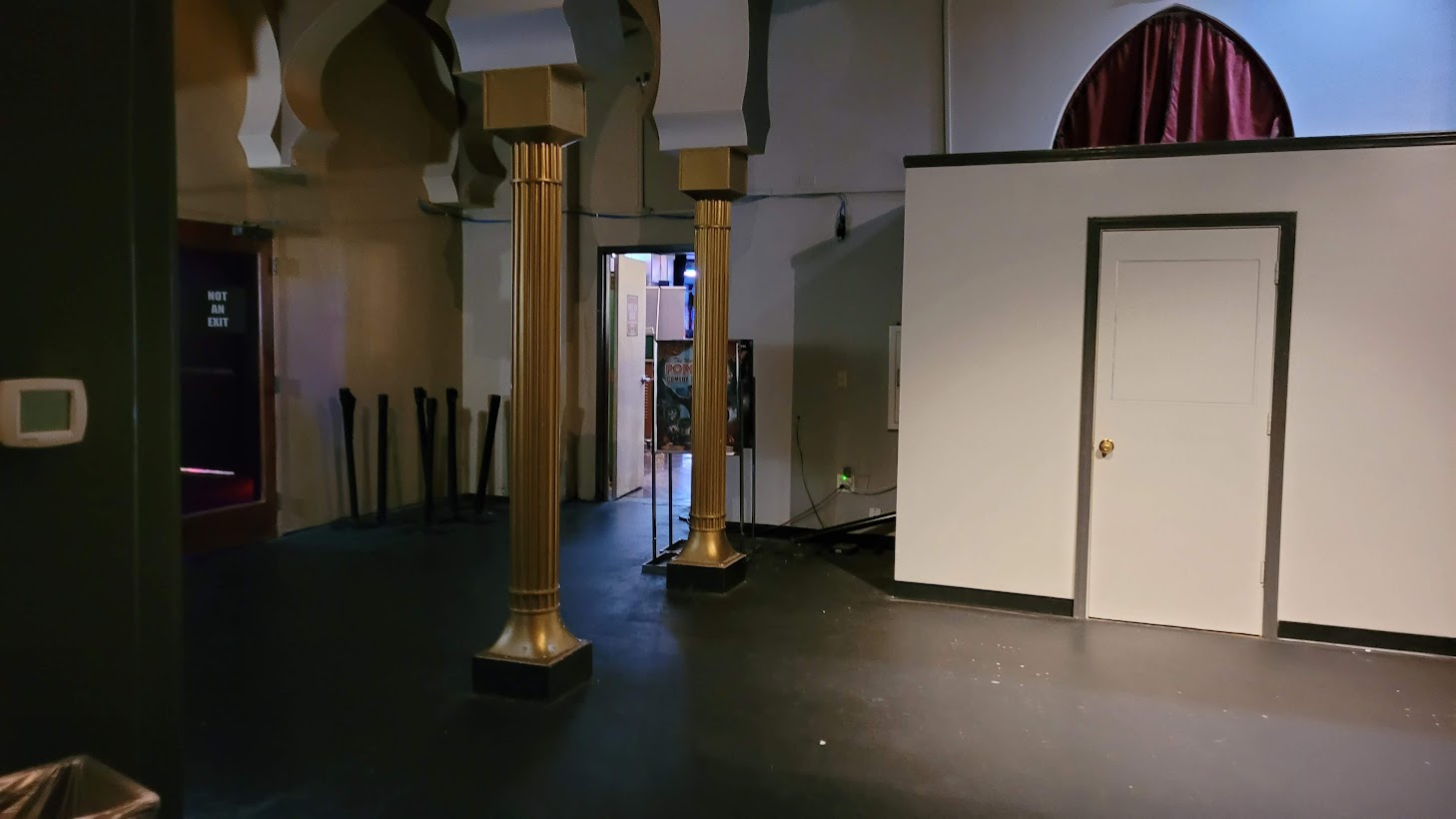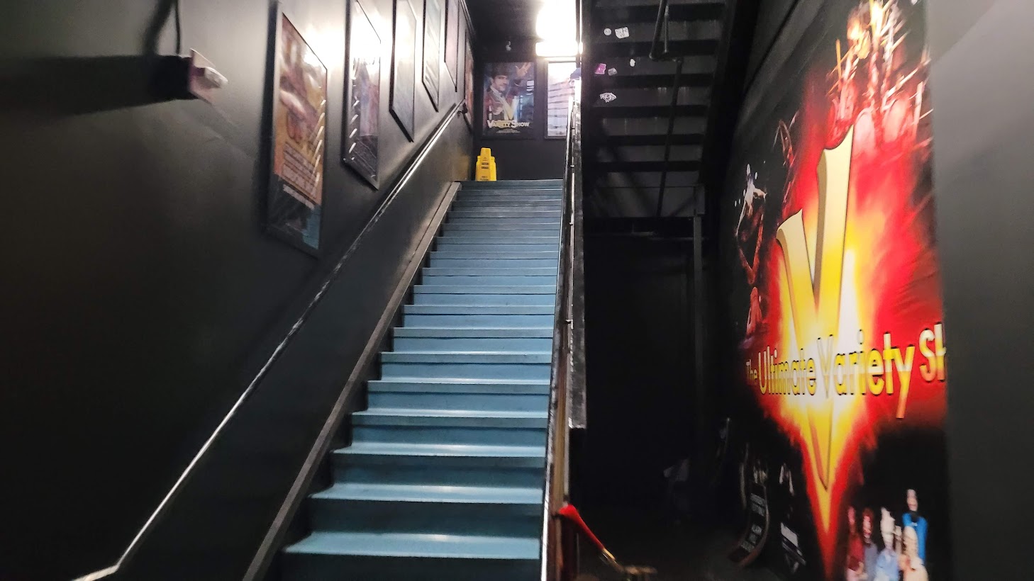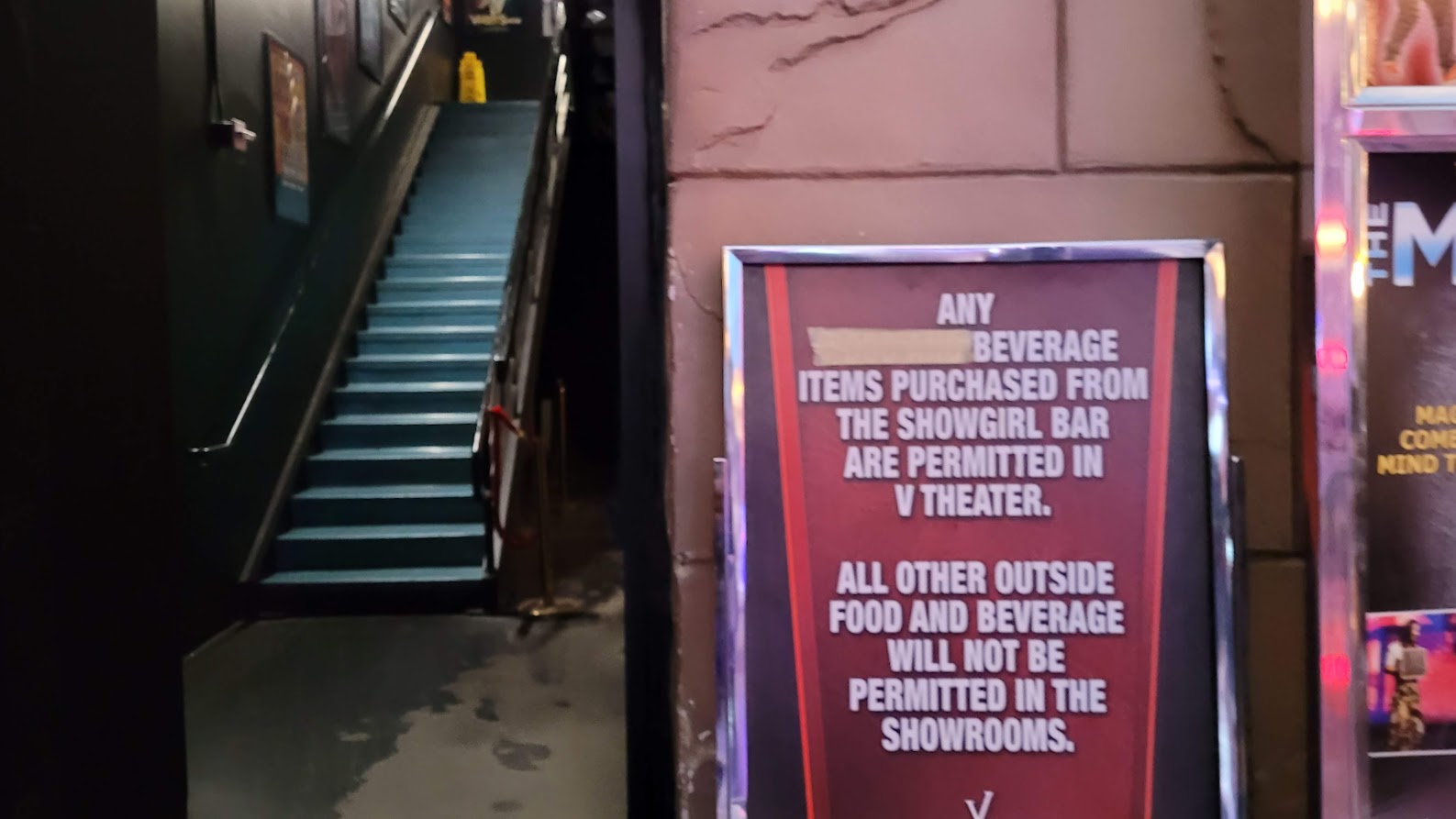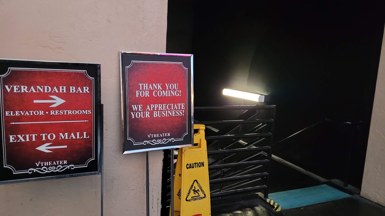 Once you arrive on the upper level, you'll take a right to access V2 auditorium or left for the V3. Along the way, you'll see exposed wiring, holes in the walls, and of course, the blocked-off VERANDA BAR.