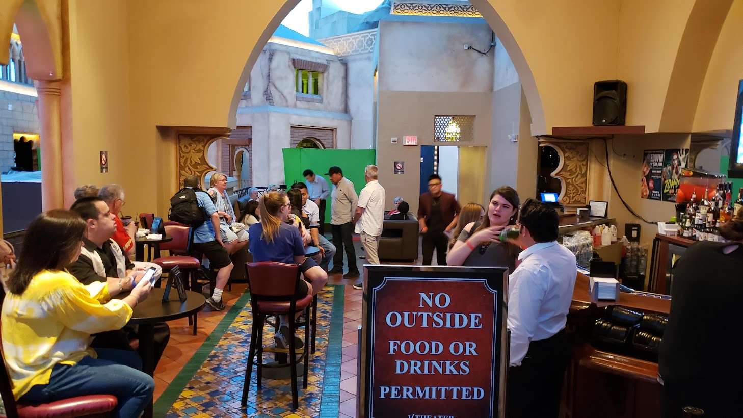 You may have strolled through the mall and seen these operations in action. To the left, guests are either purchasing or picking up their tickets, while the right is a zig-zag of stanchions leading into the ground-level auditorium. To the far left, a stairwell leads to an additional pair of upstairs theaters that can also be reached by a somewhat-hidden elevator behind the box office.
