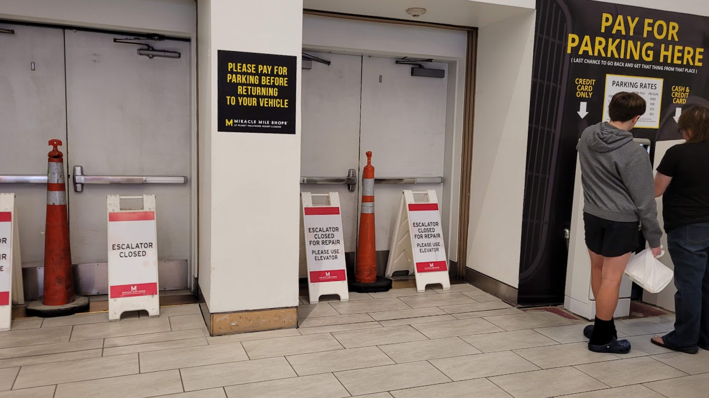 It's true that MIRACLE MILE SHOPS isn't operated by Planet Hollywood, but you'd find the same level of neglect inside the Paris Hotel, Flamingo, and Rio. They slap an "OUT OF ORDER" or "UNDER REPAIR" sign on whatever's broken and it'll probably still be there the next time you return. So will those parking fees, that were rolled out on the Strip as a pretense for "an improved parking experience". If you say so.