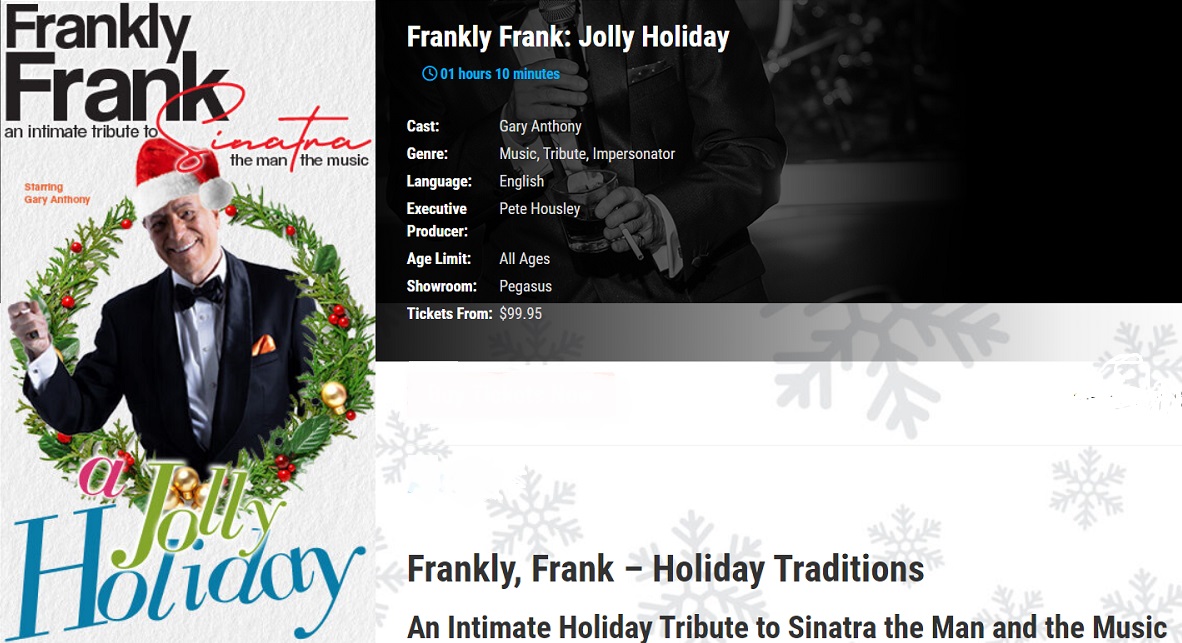FRANKLY FRANK is mere weeks into its run, yet its star Gary Anthony is already hitting the eggnog. The consummate Sinatra tribute artist will deck the halls with A JOLLY HOLIDAY, performing Sunday through Thursday at 6:30 pm. Order seats via TicketKite.com by heading here.