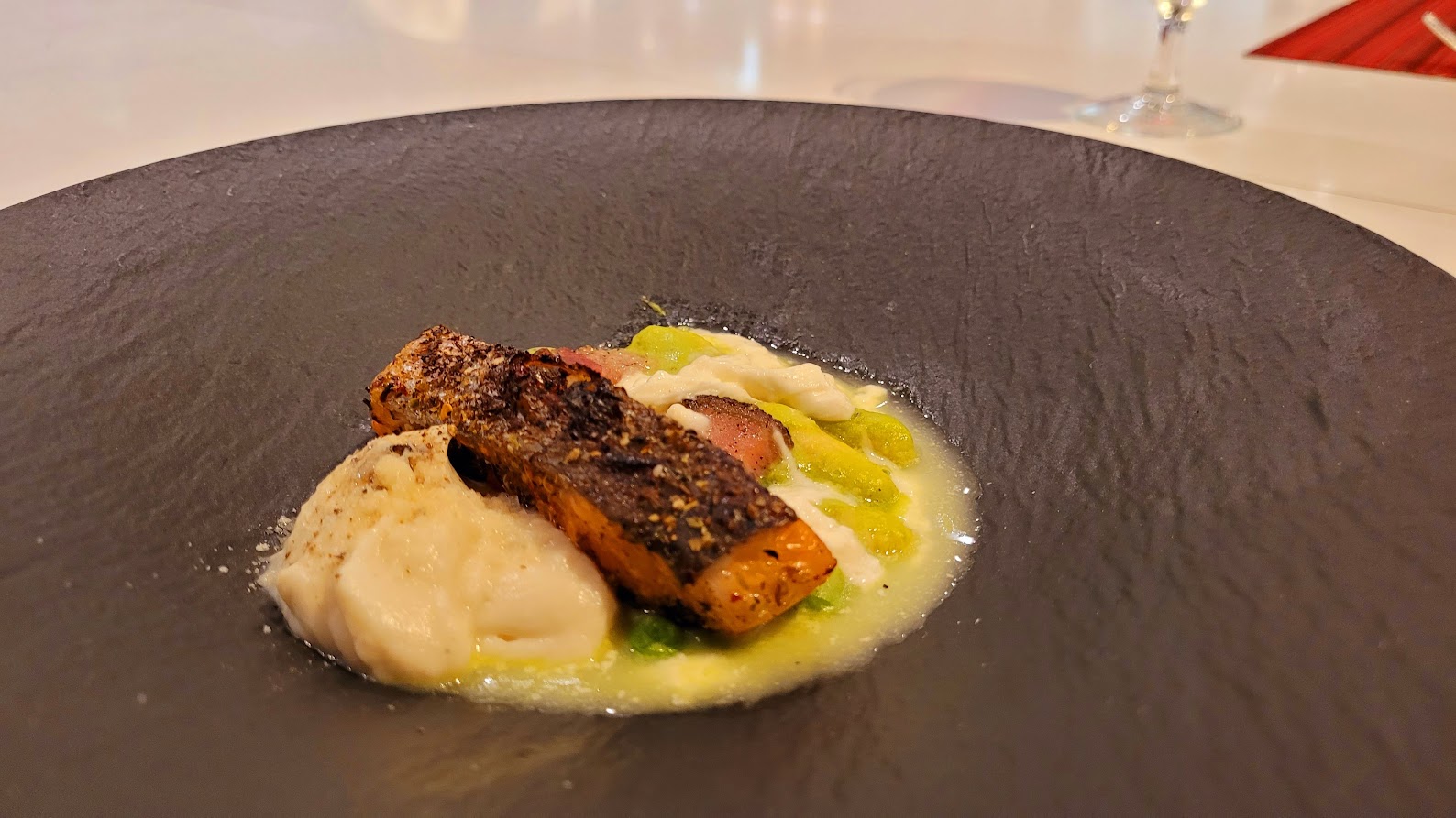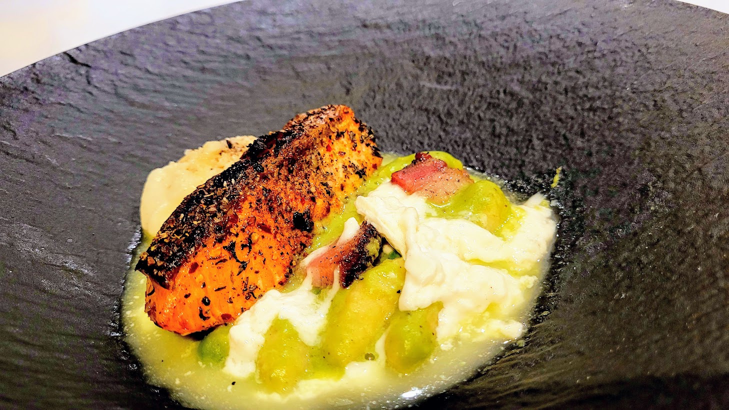 Chef Marc's persona and style are ready-made for the camera, and he enjoys creating short videos with his team. You can check out his Instagram page for dozens of great cooking ideas. Above, Chef Marc prepares a succulent New Zealand Salmon over cauliflower puree, black pepper, sweet pea, Bufalo mozzarella milk, pancetta, and gnocchi. "It has no name," he tells me as sets the dish down. "I like the colors. This is about as 'out there' as I get around here".