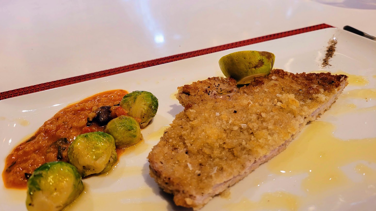 Since the meat course at my last visit was an amazing New York Strip steak, this time I'd be trying a pan-fried Pounded Veal Cutlet. Dressed up with sea salt and extra virgin olive oil, the veal was topped with arugula in lemon and lime. Accompanying this course were seafood risotto and baby Brussel sprouts seasoned with Italian sausage drippings.