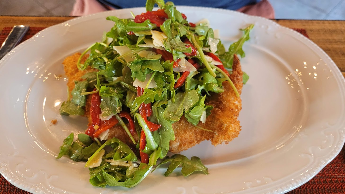 Along with steaks, seafood, veal, and pork, Chef Marc has several mouth-watering chicken dishes that are sure to satisfy. I've tried several from the brunch menu: Chicken Milanese ($19, foreground above) is served with an arugula salad, red peppers, shaved parmesan, and lemon vinaigrette. Chicken Parmesan ($19, below) is topped with marinara sauce and comes with a side of spaghetti. The dinner size of Chicken Parm is $28.