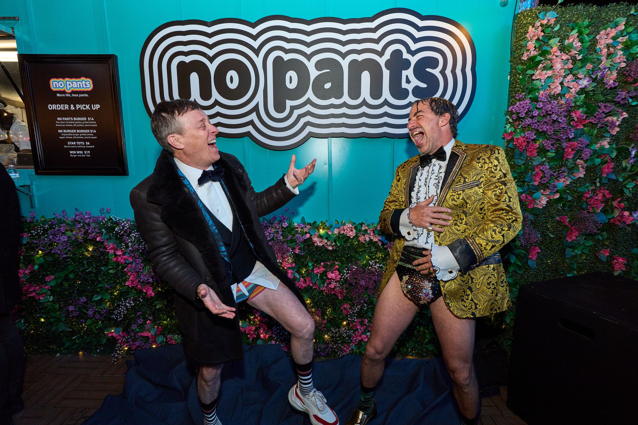 The show came to a close with "The Gazillionaire", who thanked everyone in his usual backhand way. He then introduced a 20-piece marching band that naturally performed minus pants. The band led everyone from the tent out to Green Fairy Garden for more cocktails, burgers, revelry, and schmoozing.