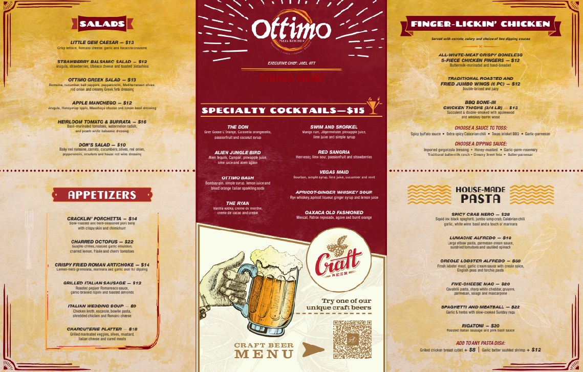 Along with pizzas, pasta, and calzones, the dinner selections include Chicken Parmesan, Scottish Salmon, Mediterranean Branzino (European sea bass), and an herb-crusted Duroc Pork Chop. Hearty salads, Wedding Soup, Charred Octopus, and Grilled Italian Sausage will compete with several styles of Finger-Lickin' Chicken for your attention.