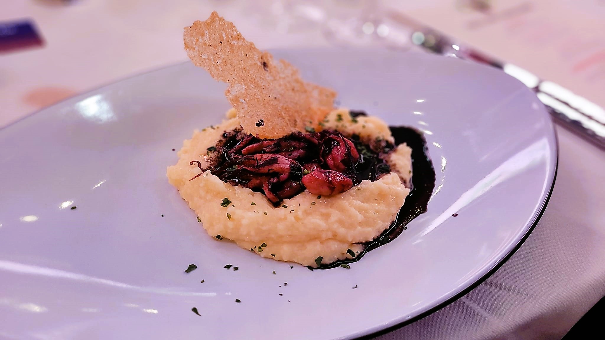 As we reached the midpoint, a pair of local musicians performed a variety of familiar and regional songs. The third course was indeed an eye-opener. Named Polipetti al Nero di Seppia, it consisted of grilled baby octopus over creamy polenta and finished with black cuttlefish ink. Paired with this dish was Villa San Zeno Soave.