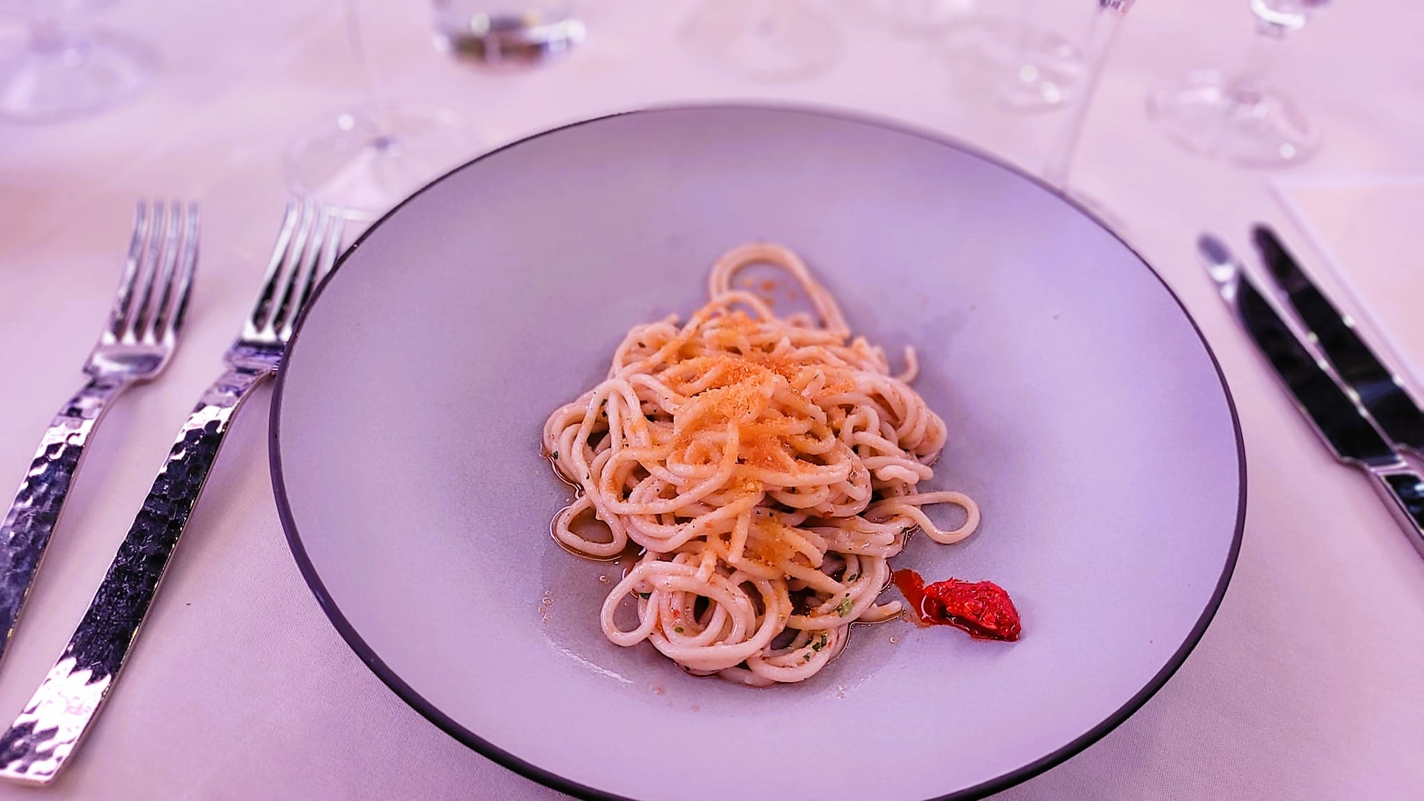 Course #2 was Spaghetti alla Chitarra Aglio Olio e pepperoncino. The dish consisted of a thick spaghetti simmered with garlic, extra virgin olive oil, and a hint of Calabrian chili. It was finished with bottarga, a labor-intensive fish delicacy. Villa San Zino Pino Grigio accompanied this serving.