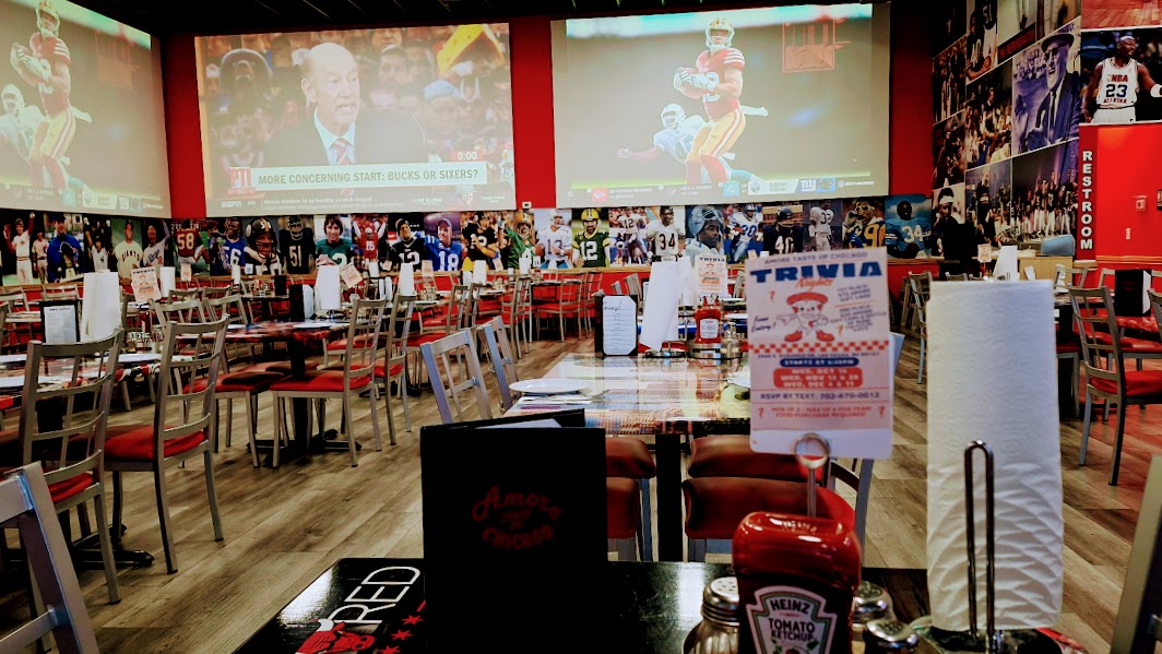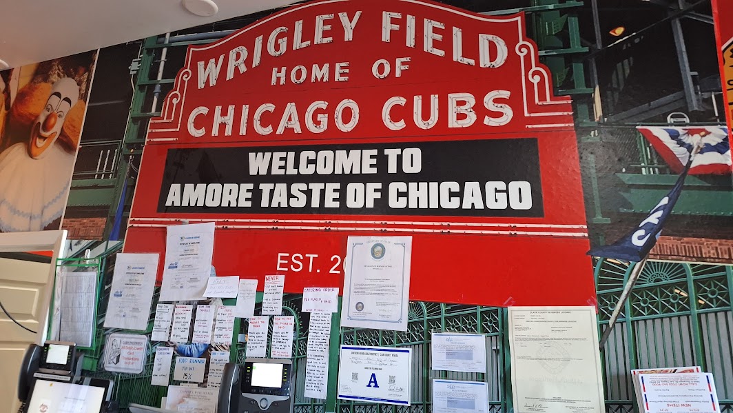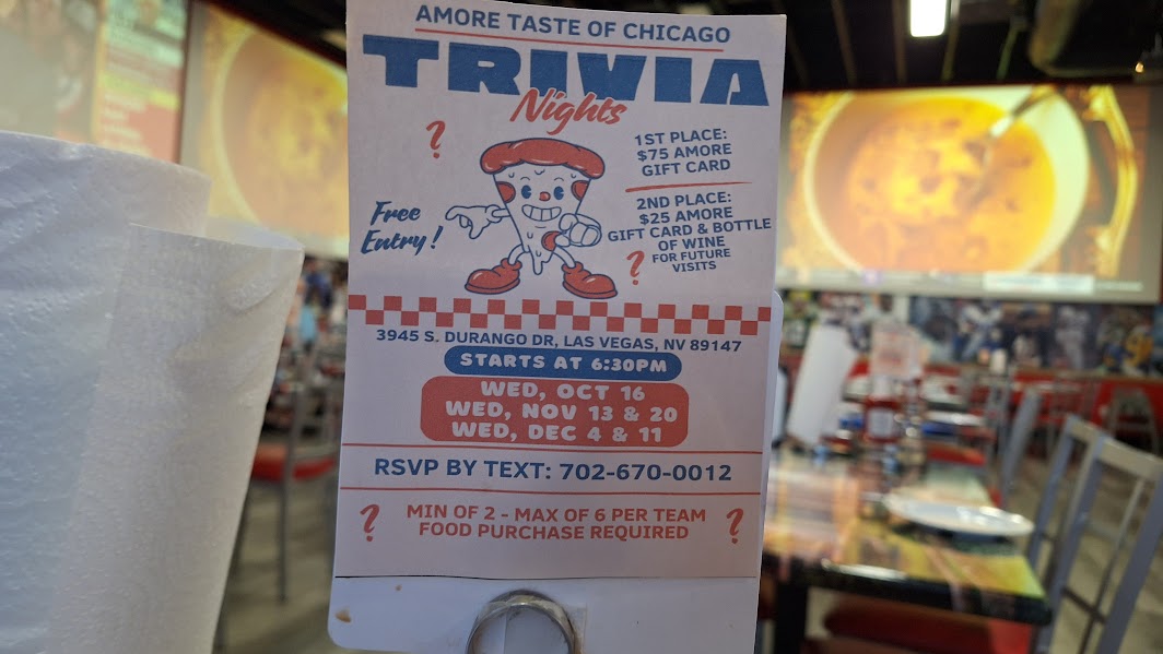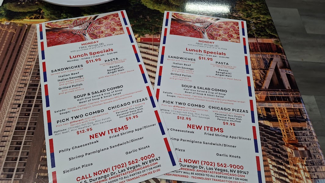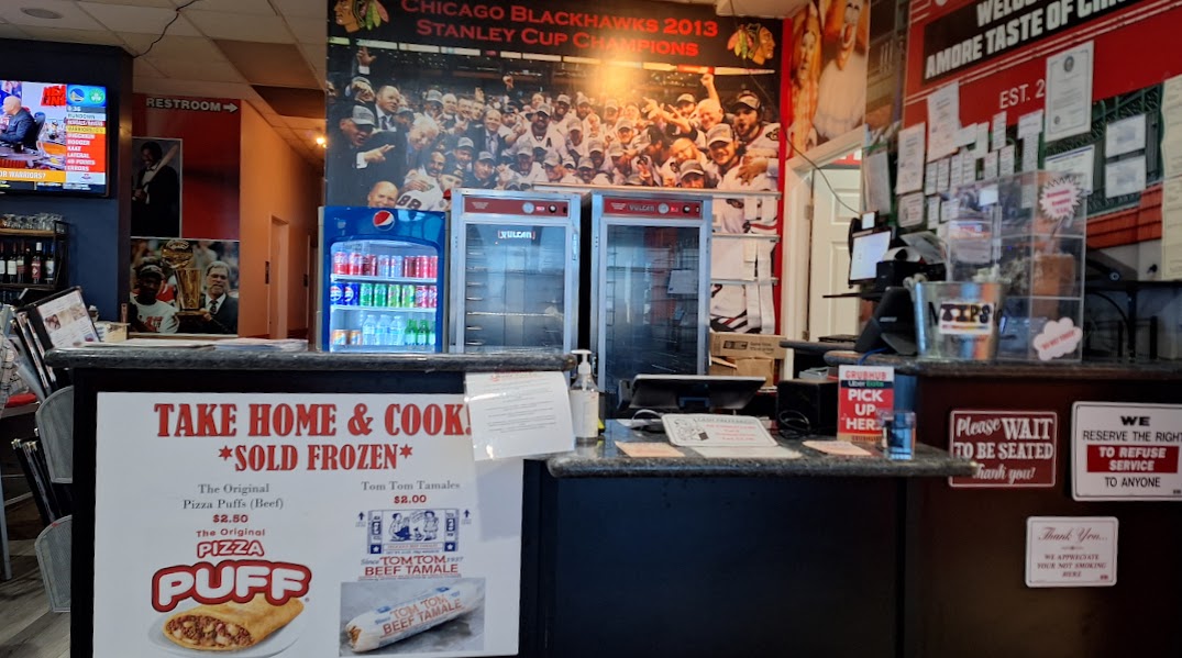 The surprisingly spacious AMORE - Taste of Chicago is nestled within an unassuming shopping center a few minutes north of the new Durango Casino. Memorabilia fills every space not covered by massive video screens. The open floor plan lends itself well to sports-fan gatherings but is just as inviting for casual dining.
