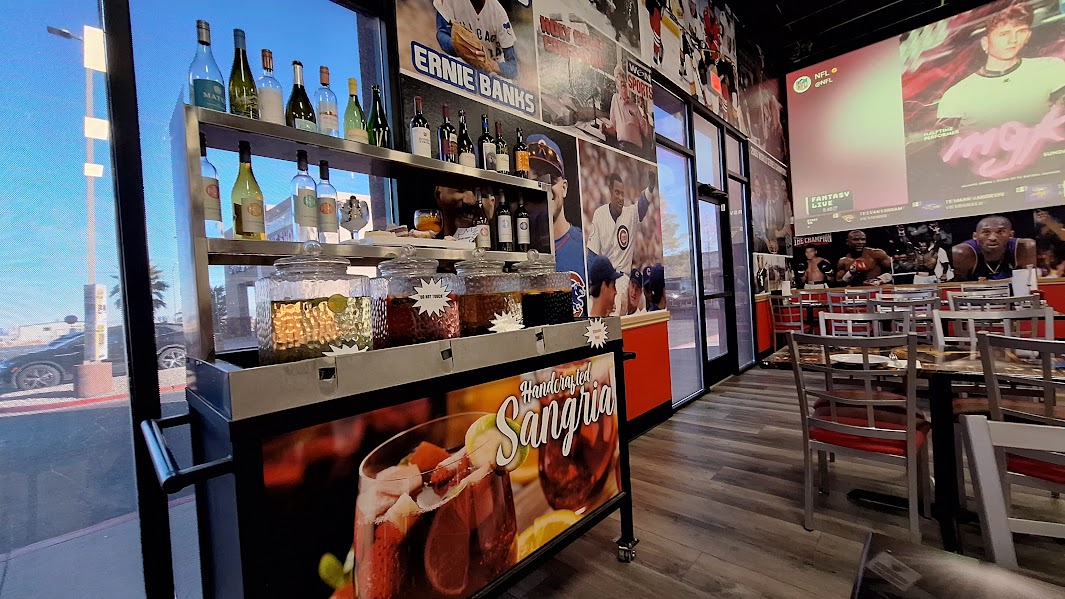While you wait for that pie to arrive fresh and hot from the oven, why not indulge in a House Sangria? White Peach, Classic Red, Mango Pineapple, and seasonal flavors are available at both locations, as are draft beer, bottled beers, and red and white wines. The Henderson location offers full bar service.