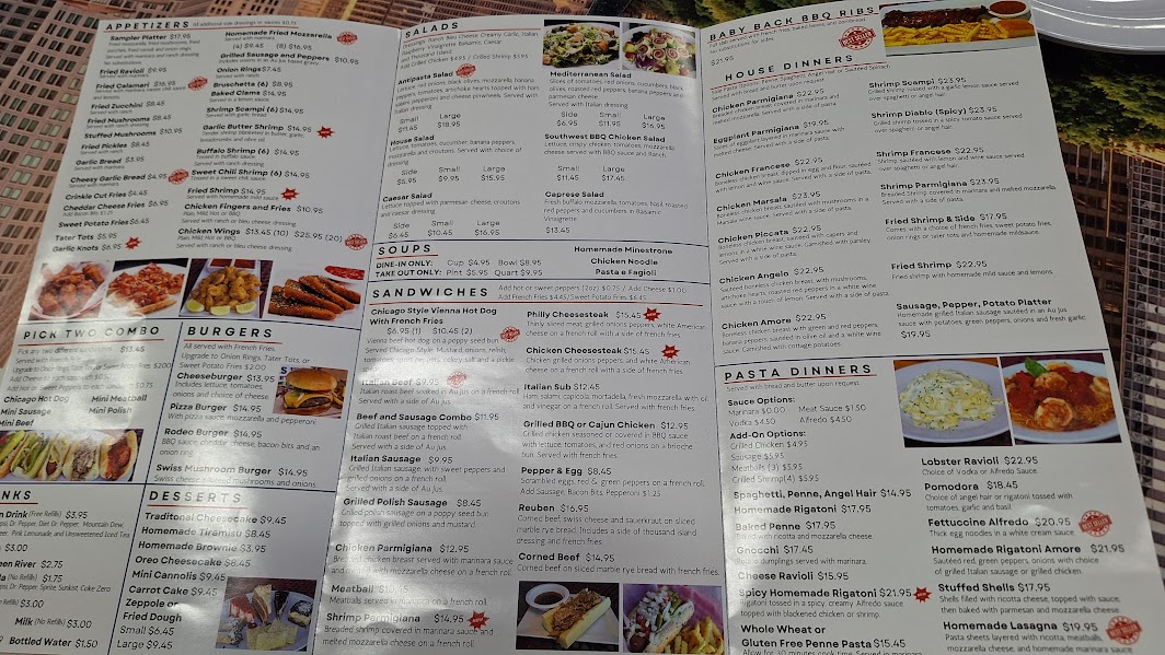 AMORE's menu isn't just extensive...it's massive. Sections include APPETIZERS, SOUPS and SALADS, PIZZA, DINNER ENTREES, CLASSIC SANDWICHES, and DESSERTS. You aren't hungry if you can't find something to tickle your taste buds.