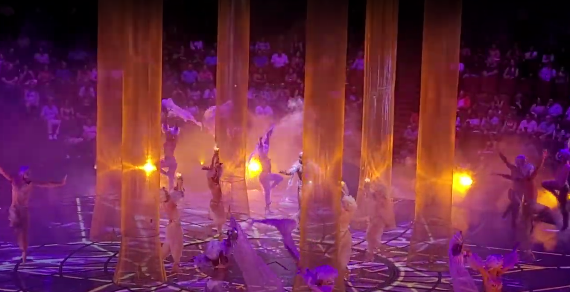 Yes, it's gone!!! A mildly sensual sequence has been introduced, making AWAKENING suitable for all ages. The "Air Realm" is now represented by a set that's deliberately gaudy, tongue-in-cheek, and campy. Influences of Roman, Indian, and Egyptian cultures combine in a song-and-dance number that culminates in an impressive levitation stunt.
