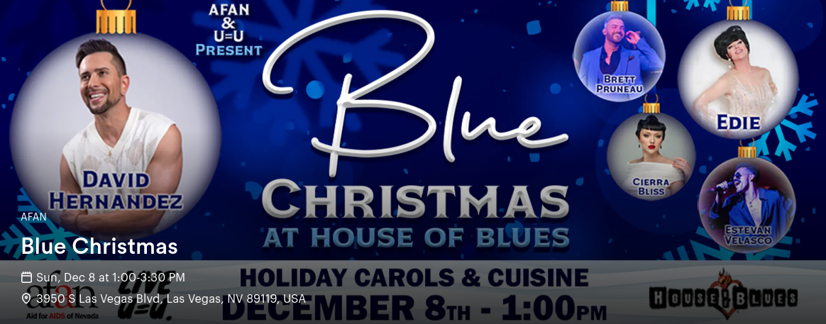 AFAN will kick off the holiday season with ‘Blue Christmas,’ a celebration of holiday carols & cuisine, hosted at the House of Blues inside Mandalay Bay Resort & Casino on Sunday, Dec. 8 at 1 p.m. Guests will enjoy performances from American Idol finalist David Hernandez, as well as Vegas-based entertainers Brett Pruneau, Cierra Bliss, and Estevan Velasco. Hosted by the infamous Edie, the afternoon will blend holiday music, food, and community while advocating for HIV/AIDS awareness and support.