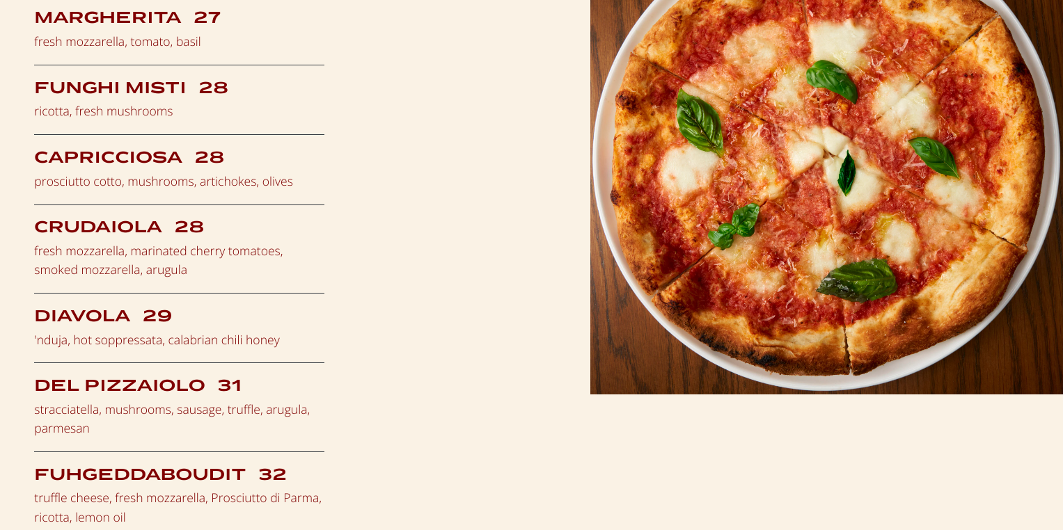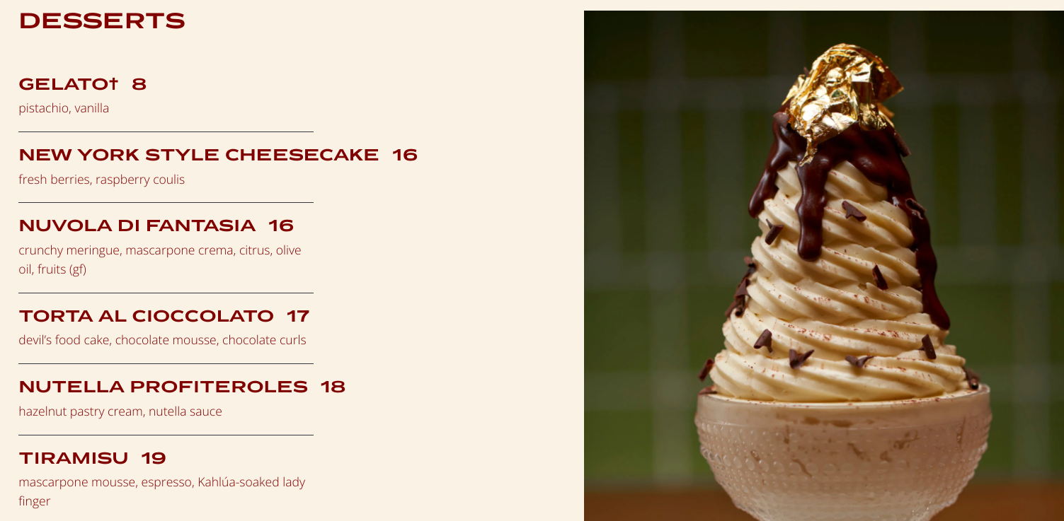 Others on the Appetizer list include Eggplant Parmesan ($21), Zuppa Di Mussels prepared with Calabrian chili, tomato, white wine, oregano, and basil ($21), and Fritto Misto ($25) with calamari, shrimp, and zucchini.