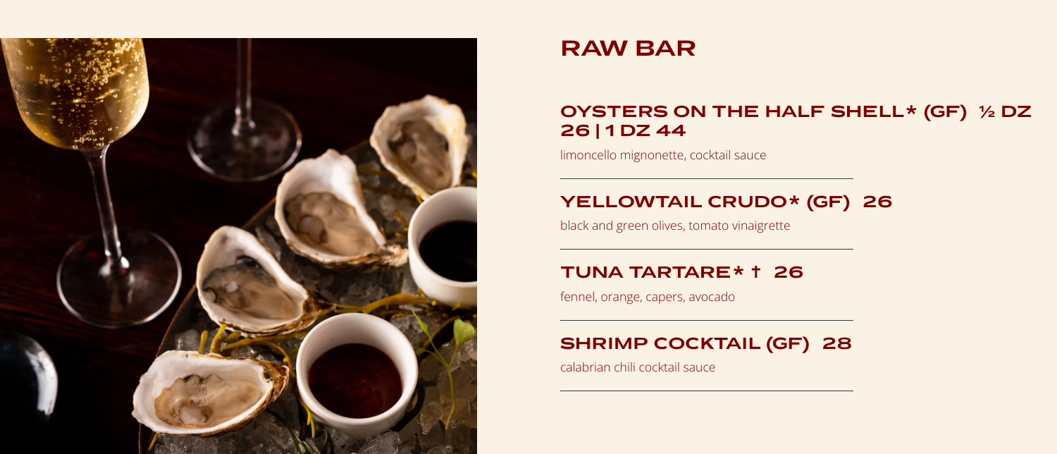 Want even more seafood? Luchini has a "Raw Bar" with Oysters on the Half Shell, Tuna Tartare, Yellowtail Crudo, and Shrimp Cocktail. For "Entrees", select from Grilled Branzino ($41), Jumbo Shrimp Parmigiana ($41), Salmon Lucianos ($42), or Chilean Sea Bass Piccata with lemon butter, capers, and parsley ($49).