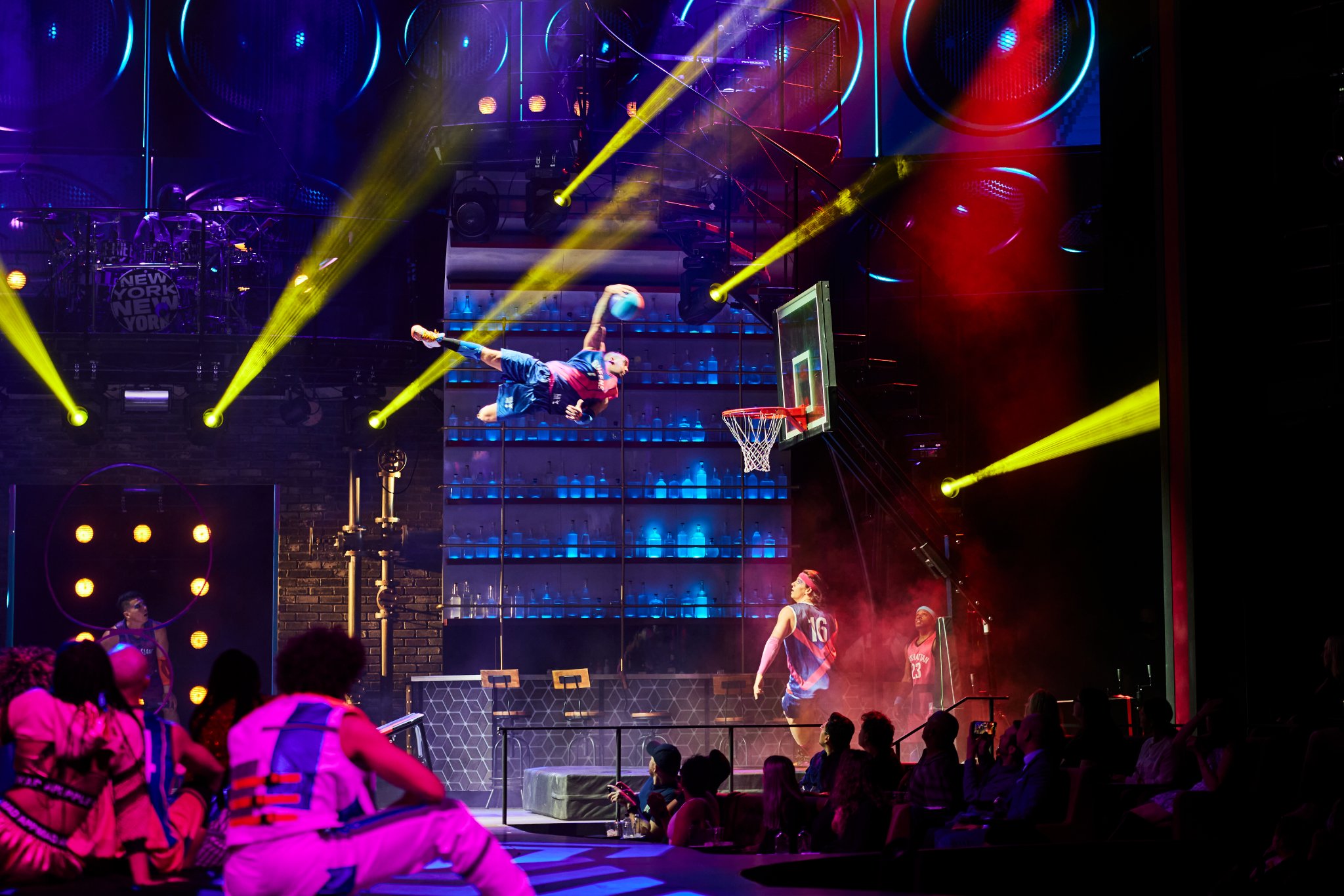 Another departure for Cirque is the choice of music. A live house band, singers, and freestyle dancers frequently become part of the show, crossing the stage, surrounding performers, and jamming throughout the audience. Recognizable songs are presented in a jazzy style that evokes the spirit of New York streets. Attractive young talent turns every moment into a block party.