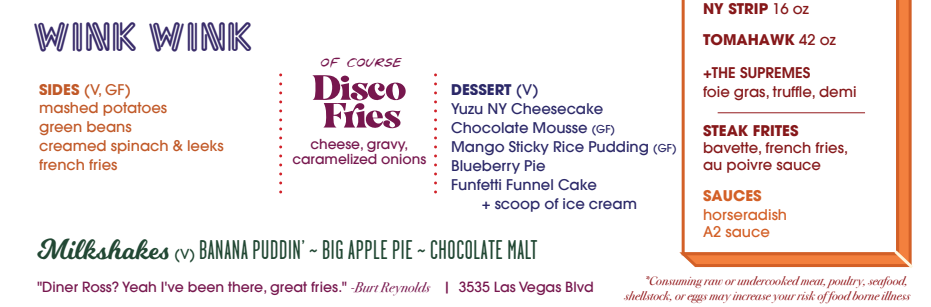 Diner Ross, 99 PRINCE, and Glitterloft are open Wednesday through Sunday from 5 pm until “late”. Make reservations by heading here. Linq Resort is located at 3535 S. Las Vegas Boulevard.