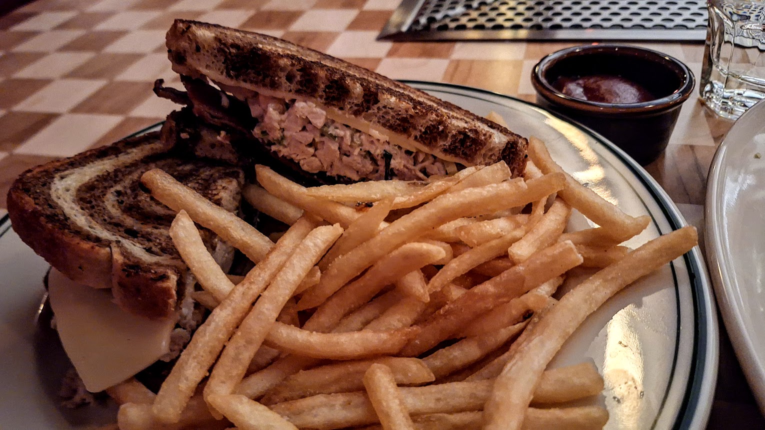 Nonplussed, this writer selected two entrees that might be found in a modern all-American eatery. The first was Grilled George ($22) a chicken salad/bacon sandwich with American cheese on two slices of toasted marbled rye. My sandwich was quite flavorful, but the included fries were bland, average, and not piping hot like they should be.