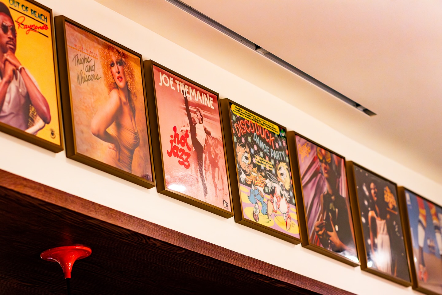 The authentic diner booths and furniture are surrounded by terrific framed photos, album covers, and movie posters (ROLLERBALL!) from the seventies. Servers wear costumes that blend vintage waitress outfits with glittery clubwear. And overhead, the greatest hits of the disco era fill the air.