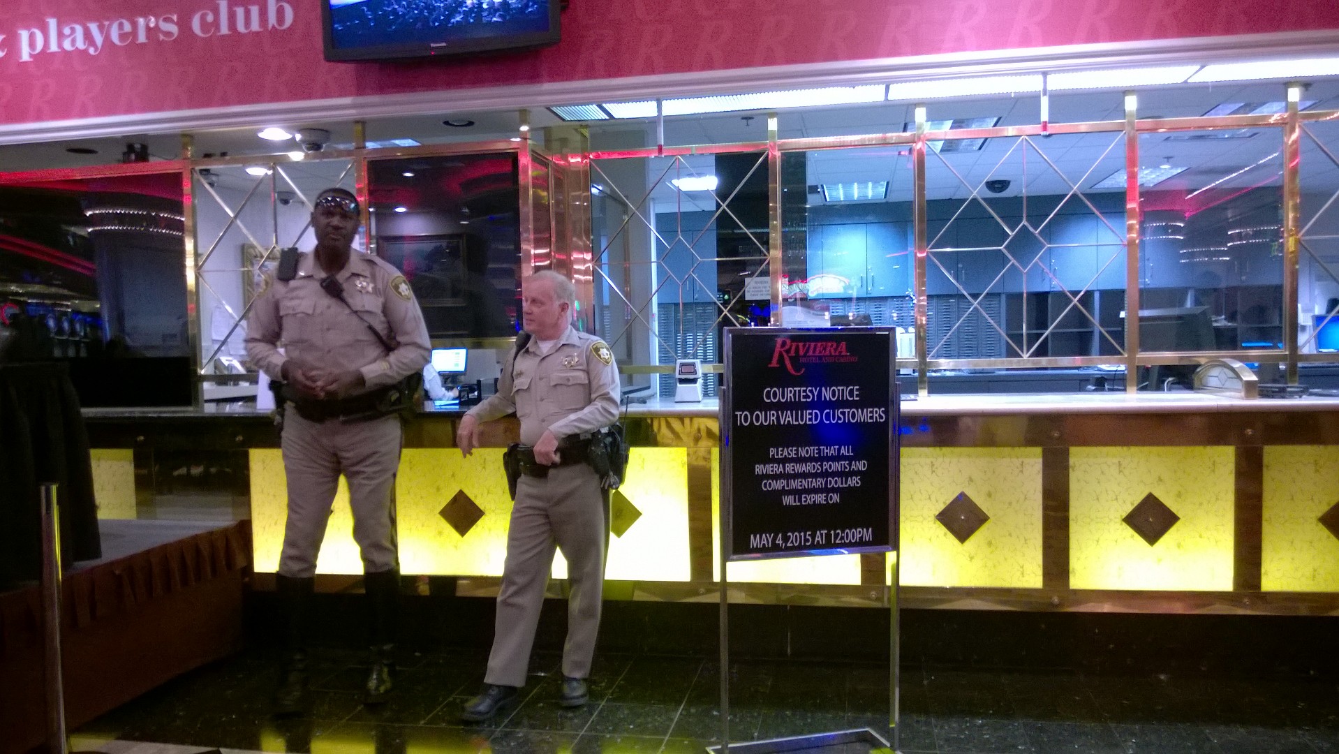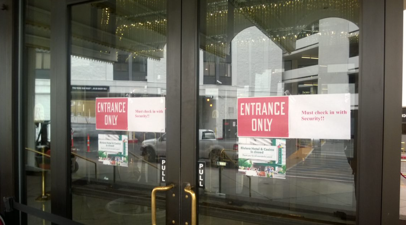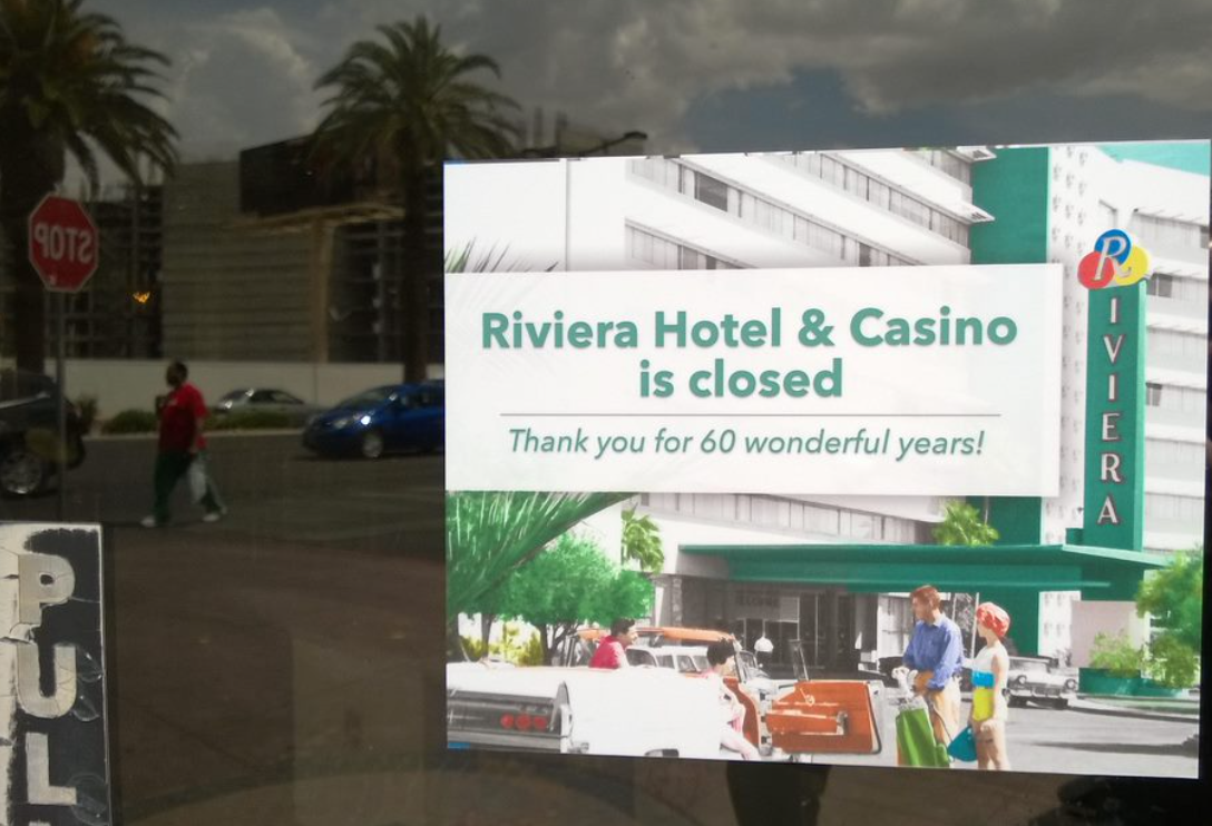 In Sin City, casino closings are almost as widely covered as grand openings (the only thing more dramatic is implosions). News crews documented Riviera's lockup and spoke to former staffers as memorabilia was stripped off and carted away. Brass handles were removed to prevent theft, and chain-link fencing was immediately placed around the property.
