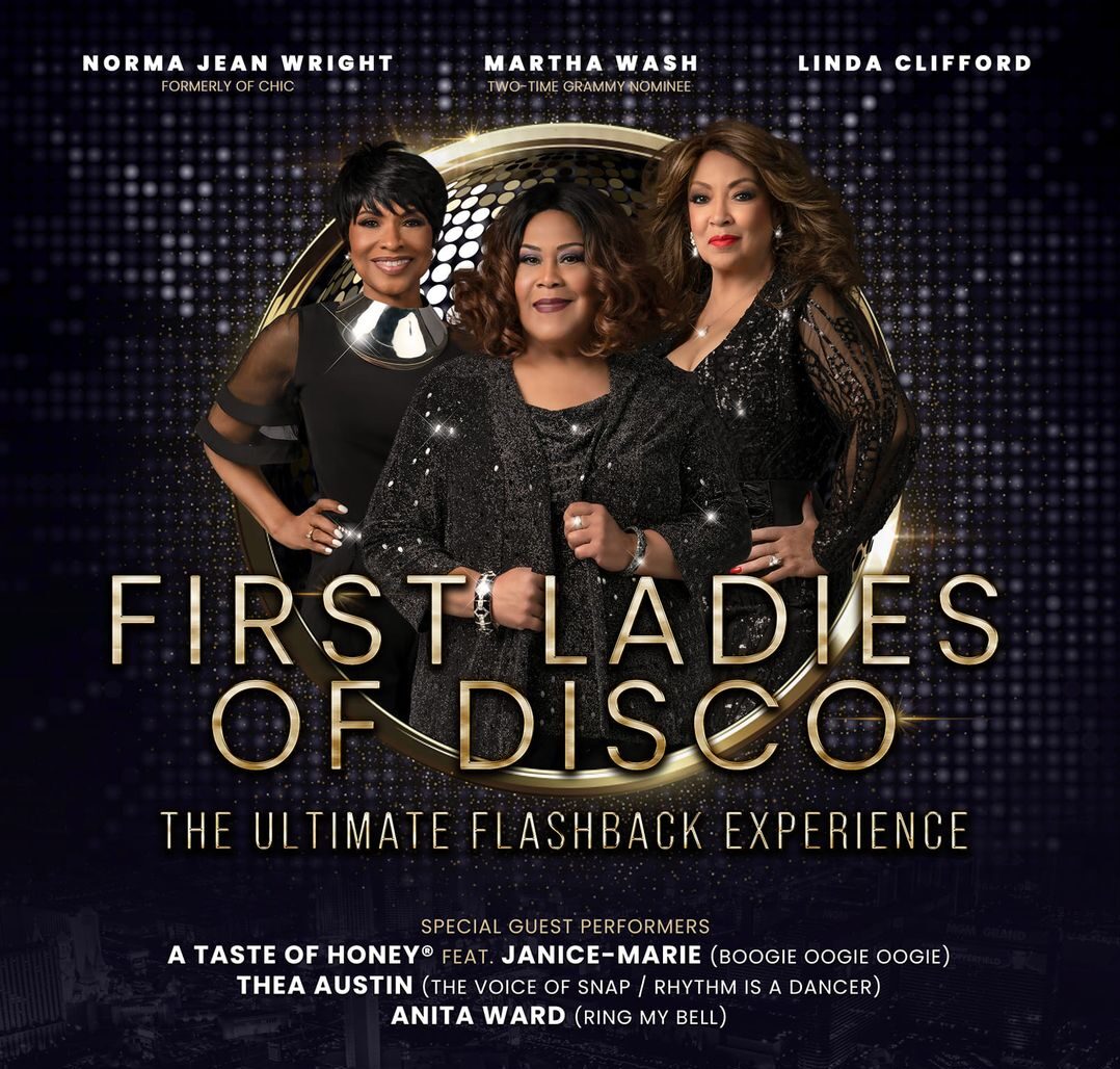 Norma Jean Wright; formerly of Chic (Dance Dance Dance); legendary Disco Soul Singer Linda Clifford (If My Friends Could See Me Now); with special guest performers Grammy nominee Anita Ward (Ring My Bell), Thea Austin, International Platinum Top 100 Chart-topping voice of SNAP (Rhythm Is A Dancer), A Taste of Honey featuring.Janice-Marie (Boogie Oogie Oogie); and the legendary actress and comedian Marsha Warfield (Night Court, Empty Nest, and Netflix's The Upshaws), in a night of unforgettable music, fun, and laughter!