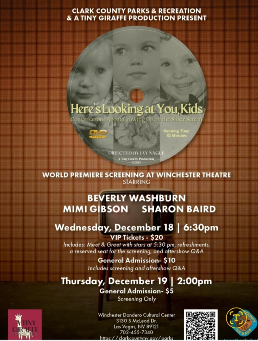 HERE'S LOOKING AT YOU, KIDS - Conversations About Growing Up on the Silver Screen is directed by Nagle. It chronicles the lives of Mimi Gibson (Disney's original 101 Dalmations), Sharon Baird (1955's Mickey Mouse Club), and Beverly Washburn (Old Yeller).