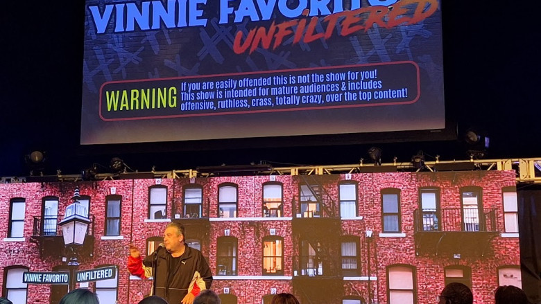 After a stirring encounter with the dead, we "crossed over" from NOTORIETY's "Chandelier Room" to the "Robin Leach Theater". There, we grabbed the last few minutes of VINNIE FAVORITO: UNFILTERED. The insult comic, who's somehow as adorable as he is abrasive, is always a great time.