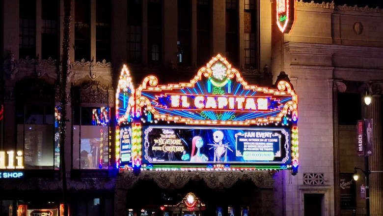 Tim Burton’s THE NIGHTMARE BEFORE CHRISTMAS is apparently huuuuuge around Hollywood this time of the year. Not only is it playing at Disney’s gorgeous EL CAPITAN Theater (above), but a live presentation at the Hollywood Bowl has become an annual event.
