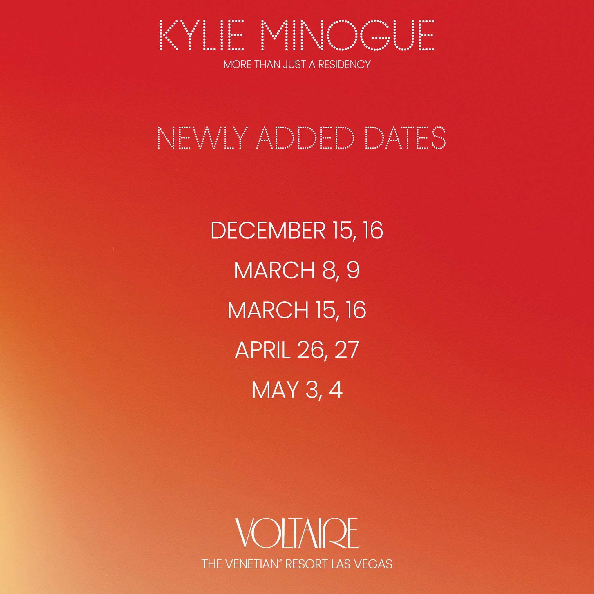 [embed]https://vimeo.com/850615248[/embed] UPDATE 8/14/23 - Even more big news from Venetian Resort Las Vegas and superstar Kylie Minogue: "OMG …. Sold Out!?! So humbled by this overwhelming response. So much so, that we are adding ten more dates! I know many of you missed out on a ticket or had to wait a long time. Sorry, there was a system overload! (#LOVERS power ?) Hope you can bag your ?? for one of these new dates. Can’t wait to share this Vegas experience with you." @voltairelv Available Thursday 8/17/23