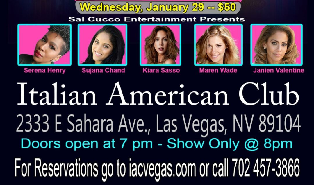 "Where else can you get numerous beautiful superstar singers all in one show? Italian American Club for the Las Vegas Bellas premiere. If you love Sal Cucco‘s The Fourmers, you’re in for a real treat. Las Vegas Bellas features Maren Wade, Serena Henry, Sujana Chand, Kiara Sasso, Robin Vincent, and me! Come on down, sing along, dance along, and relive the good ol’ days!" - Janien Valentine
