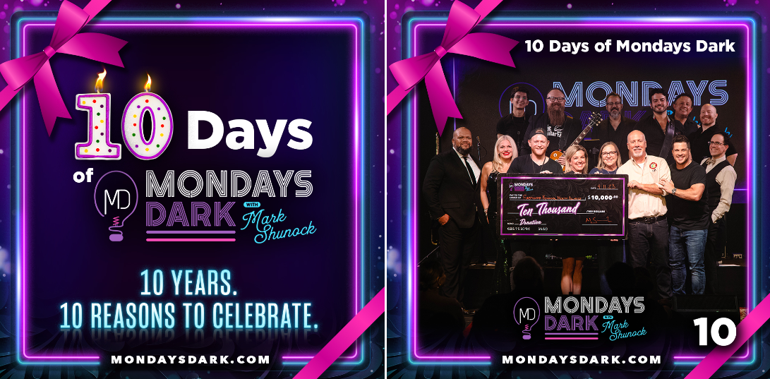 Golden Knight's man-on-the-mic Mark Shunock created the concept for MONDAYS DARK with his wife Cheryl Daro. After relocating here over a decade ago, they fell in love with the giving spirit of Las Vegas and wanted to be a part of it. The slogan of "Let's raise $10K in 90 minutes" was born.