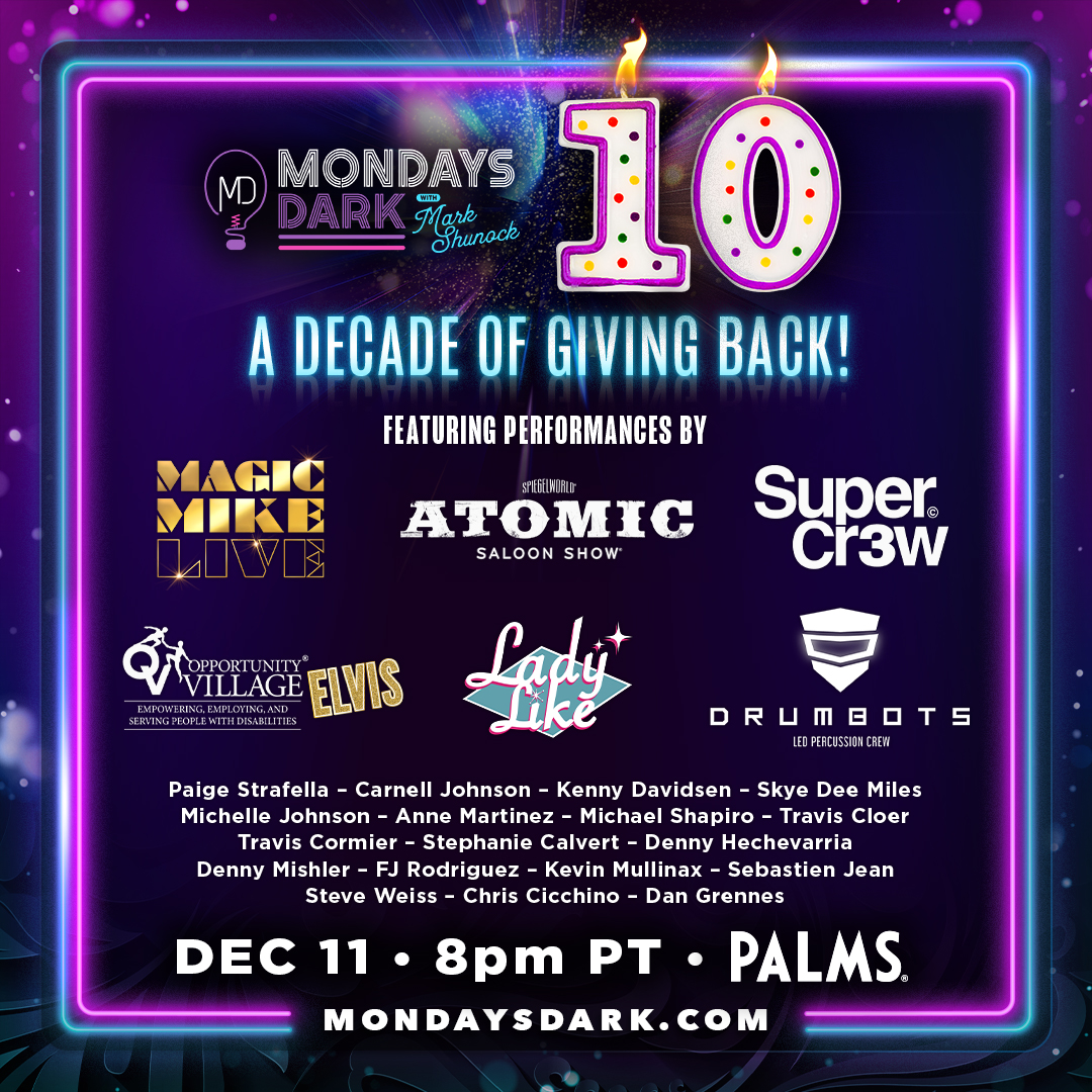 The 10-Year Gala will be held this year at The Pearl Theater of Palms Hotel Casino. In the ten days leading up to the party, the official Mondays Dark Facebook Page will post a list of fun facts, trivia, and statistics. You can follow along by clicking this link.