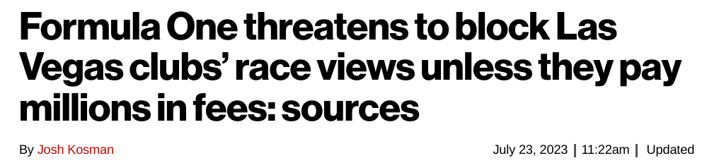 Barricades are being erected to block the view from businesses that refuse to pay a fee to the organizers. These establishments, which are currently suffering catastrophic losses thanks to the road chaos, are literally being held hostage by an outside source. This, of course, will affect the price of everything you buy from them going forward. Tell me how F1 is "good for Vegas" the next time your basic cocktail costs $30.