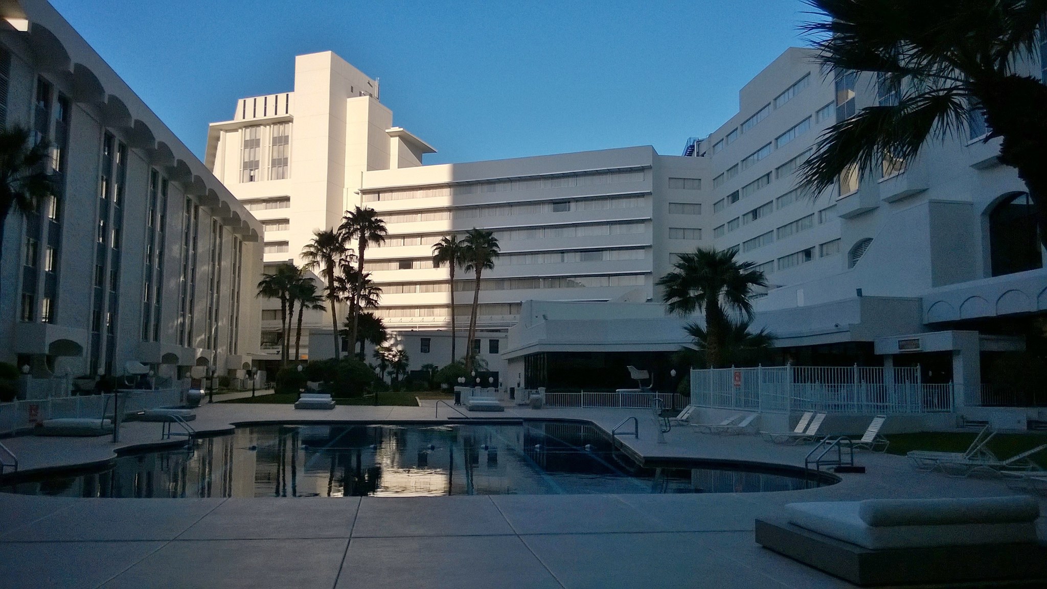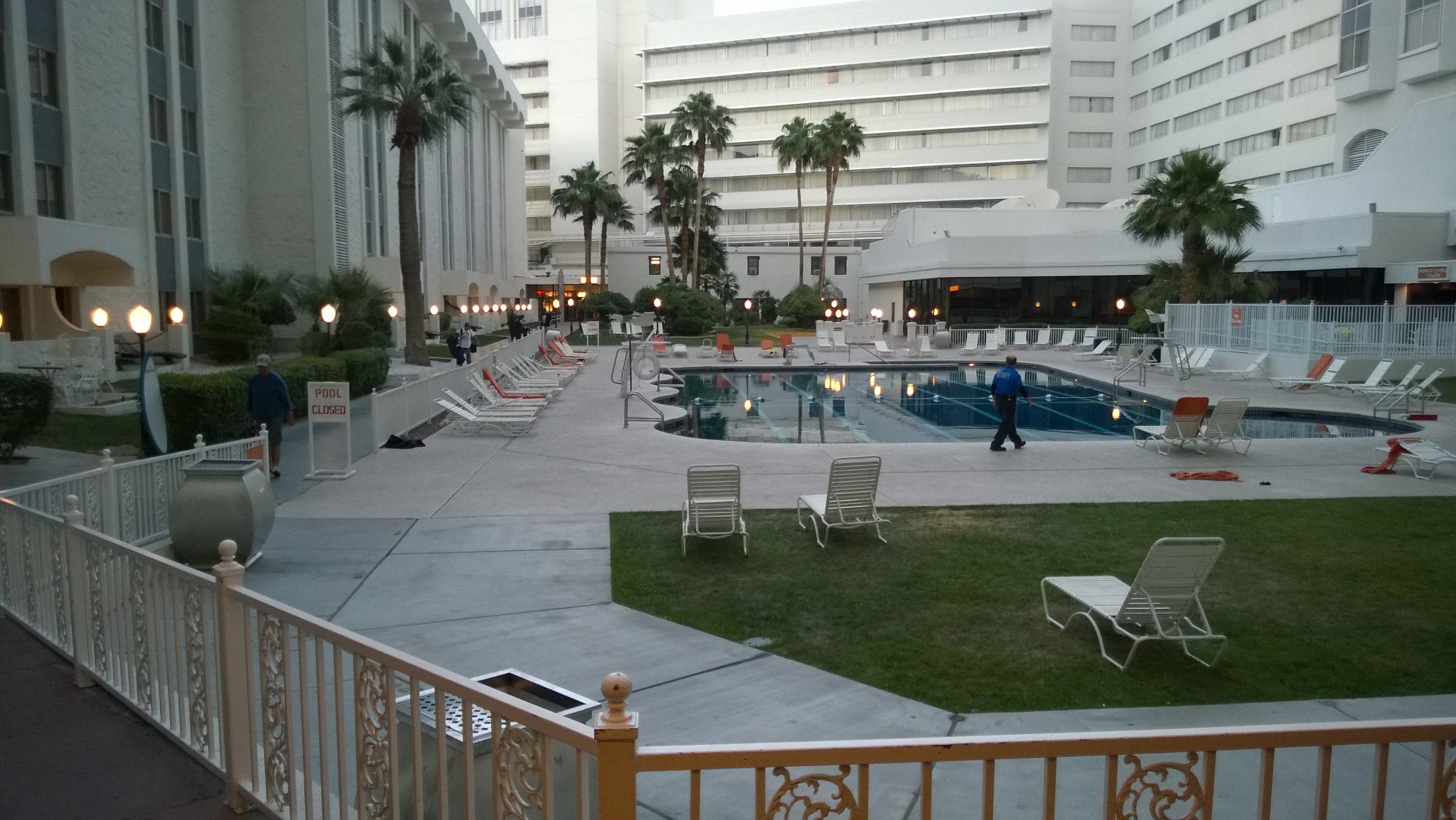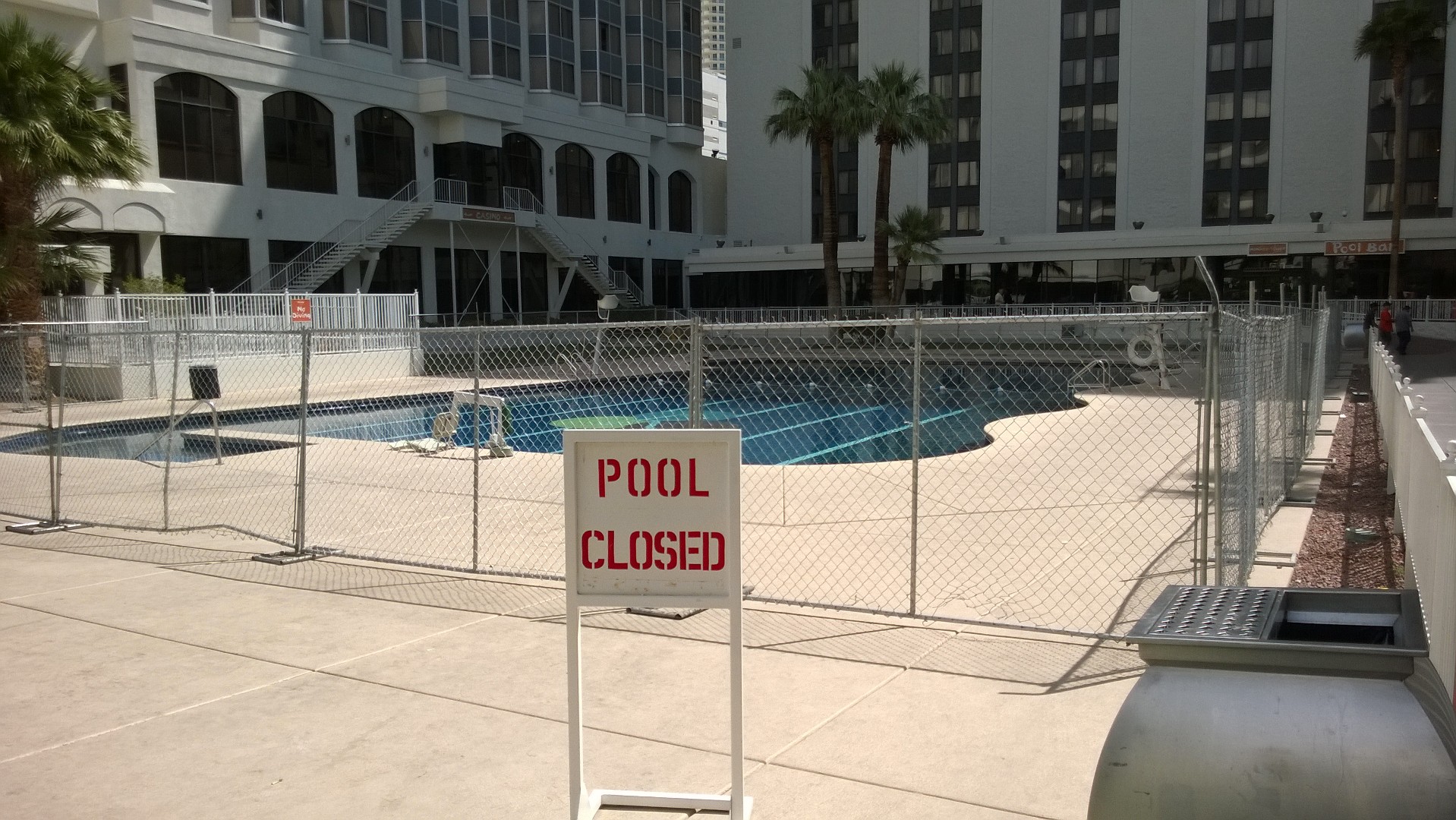 Of course, Riviera did have a functional pool, which received many years of use. It was located on the ground level and surrounded by numerous hotel towers. Access had already been closed off, and workers would begin constructing fences around it the next morning.