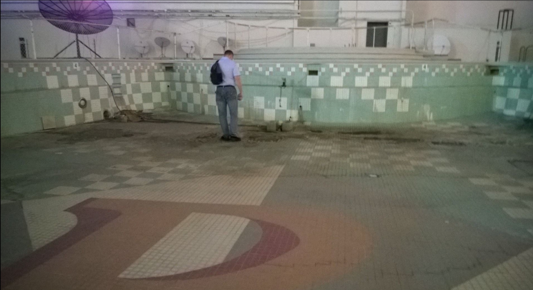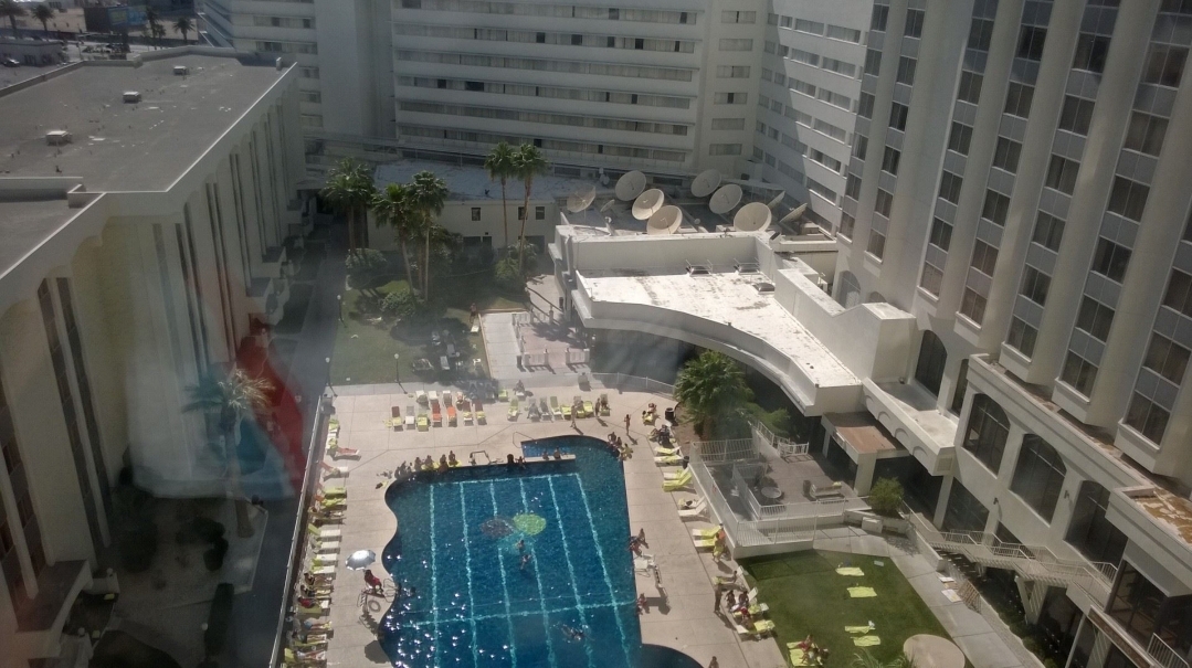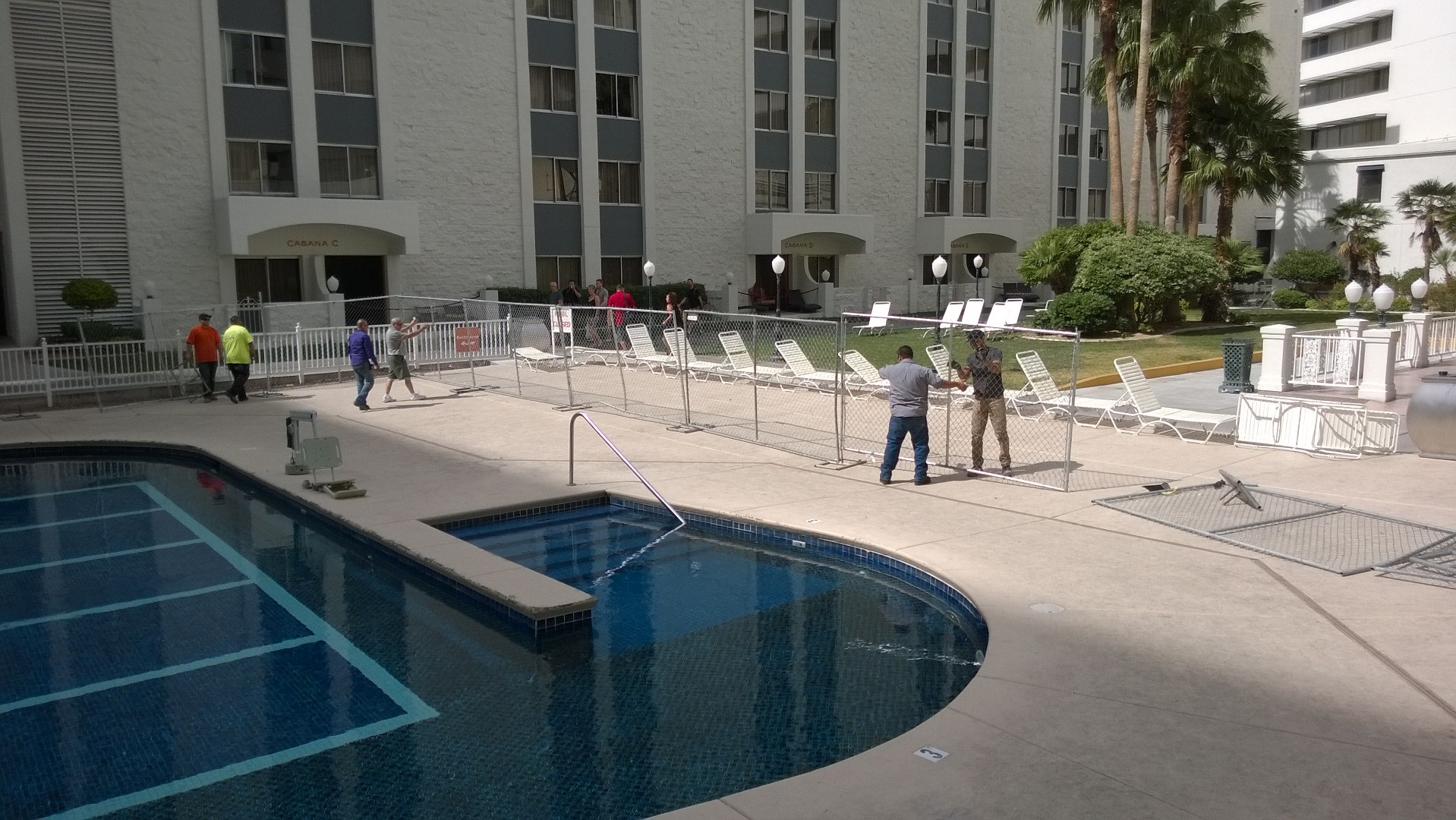 Of course, Riviera did have a functional pool, which received many years of use. It was located on the ground level and surrounded by numerous hotel towers. Access had already been closed off, and workers would begin constructing fences around it the next morning.