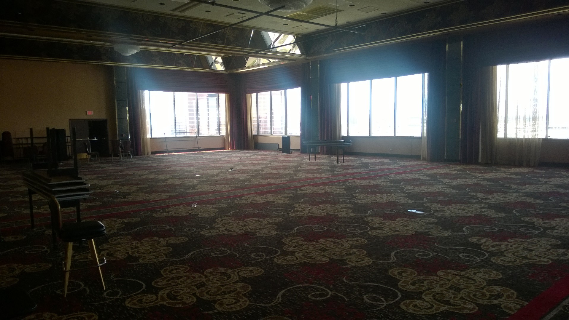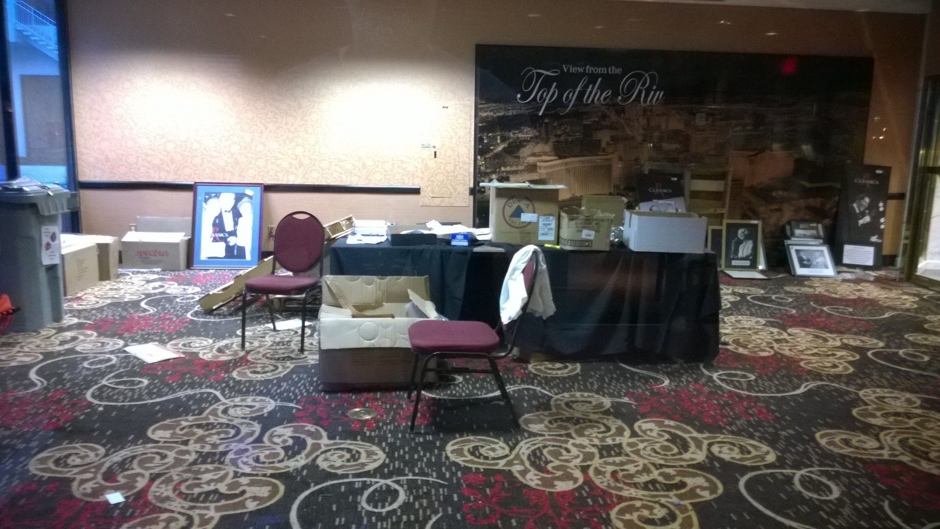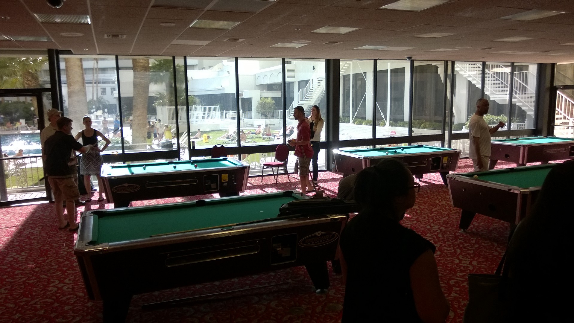 Prior to dinner, we visited several sections of the property, including the glorious top-floor TOP OF THE RIV ballroom. With its outstanding view, the space was known for hosting amazing New Year's Eve parties. A pool tournament had recently been held near the reservation lobby, and tables were in the process of being removed.