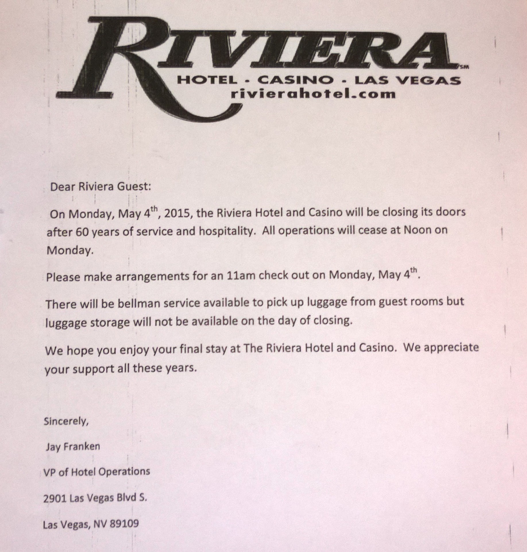 The 11 am cutoff was fast approaching. We checked out, placed our luggage in the rental car, then headed back inside to record Riviera's final moments before doors were locked forever.