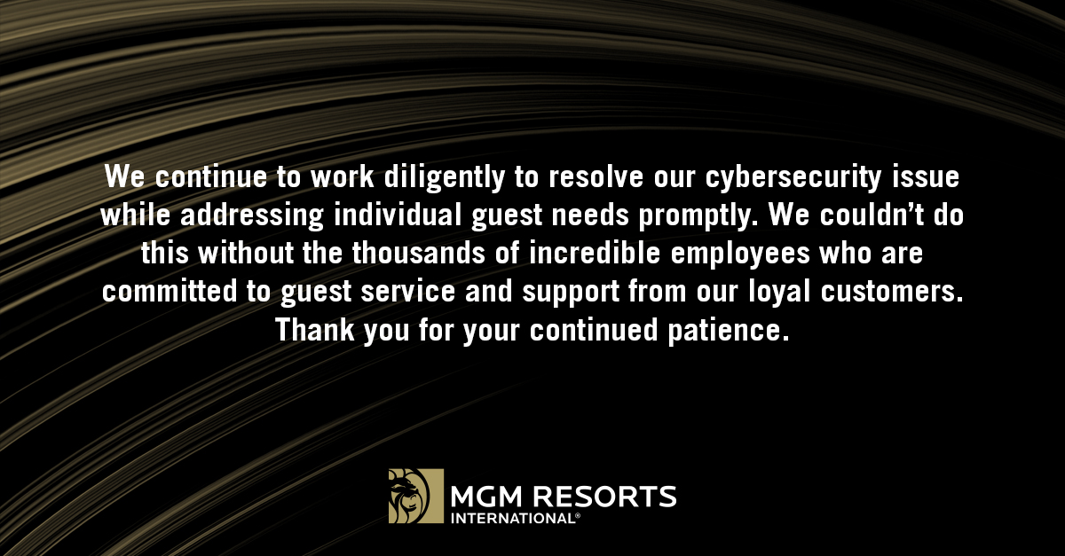 MGM Resorts has not updated its official Facebook page since September 14th regarding its operating status. That was five days ago at the time of this writing. They have, however, created a dedicated web page that supposedly reports in real time what systems are currently operating. In the meantime, MGM continues to lose millions per day (estimates vary wildly depending on the source).