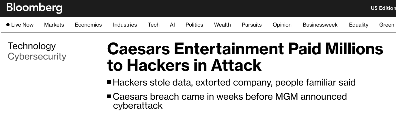 We now know that Caesars Entertainment, the other "big" name in Las Vegas, was threatened with a similar cyberattack a few weeks ago. Opting to pay a reported $30 million ransom, Caesars properties like Flamingo, Harrah's, Horseshoe, Cromwell, The Linq, and Caesars Palace appear to be operating normally...for now. While caving into terrorist demands is usually an undesirable option, Caesars' choice was undoubtedly worth the "investment" in hindsight.