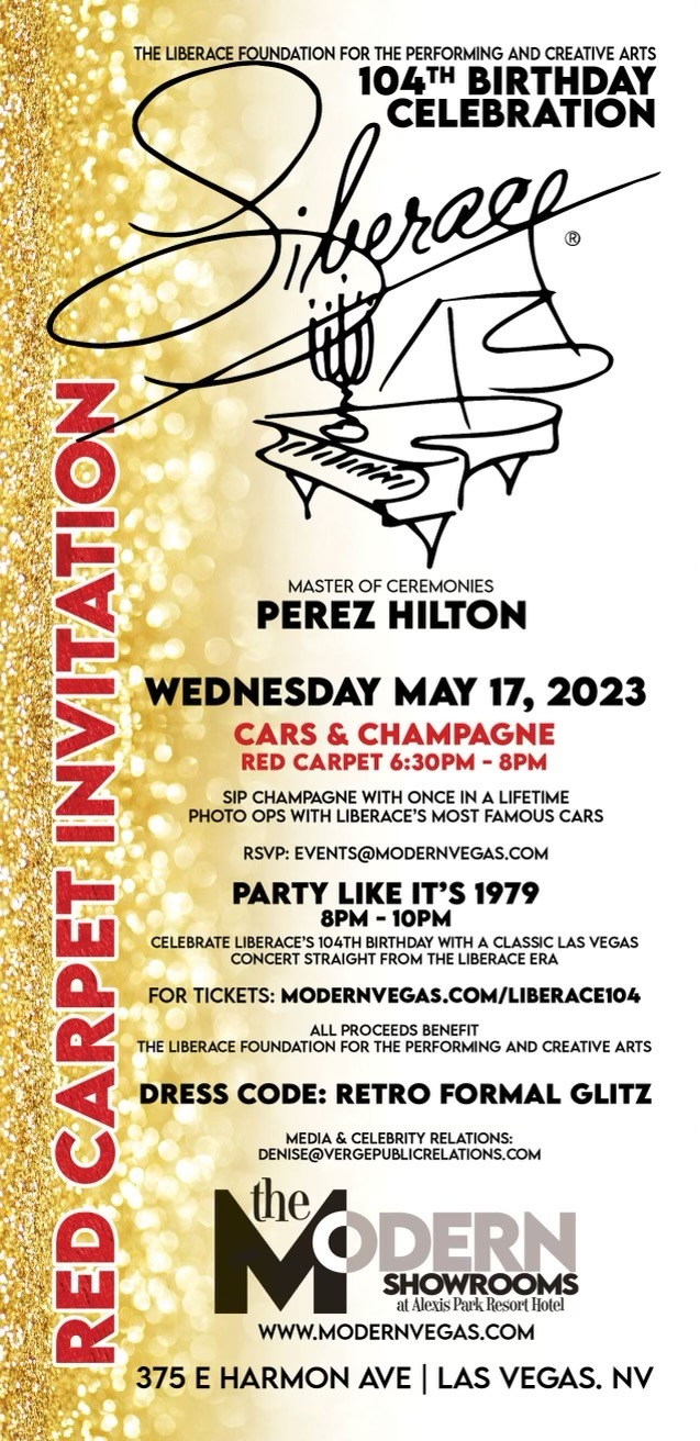 The "Liberace 104th Birthday Benefit" will take place at 8 pm on Wednesday, May 17th, at Alexis Park Resort. The evening kicks off with a magnificent red carpet-experience. Students from the Nevada School for the Arts will be playing an actual Liberace piano placed atop the carpet at the resort's porte cochere.