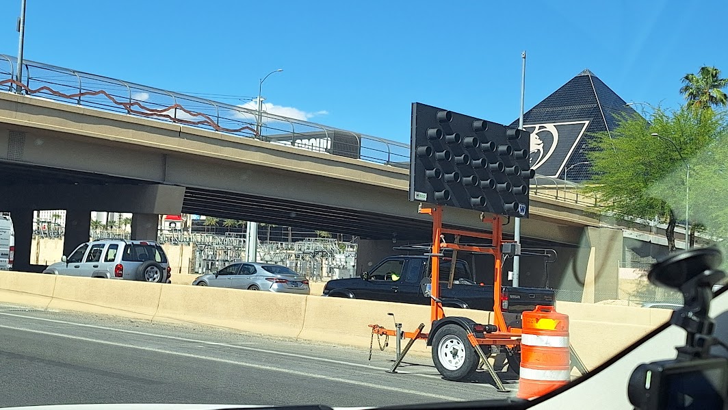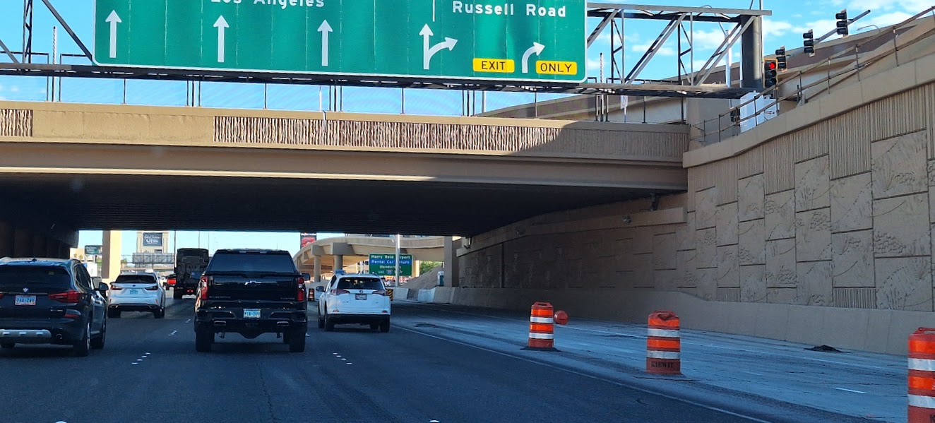 I took these photos on Wednesday, May 14th, driving through the "former" construction zone from both directions. Does this look "fully open and at capacity" to you? Our VEGAS 411 Facebook page posts regular updates on lane restrictions, ramp closures, and entire shutdowns in this zone. They're scheduled well into July.