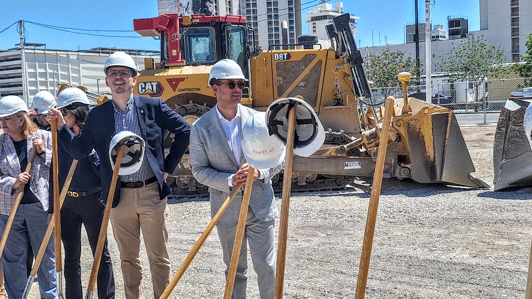 Patrick Brennan (right) holds a shovel on the grounds of the future CELLO TOWER
