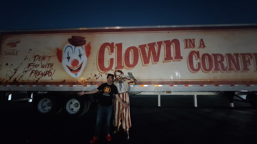 Drive-in exclusive screenings were held Friday and Saturday before the film opens nationwide on May 9th (get locations and showtimes here). Ticket buyers received a specially commissioned full-size poster. Author Adam Cesare was present, along with "Frendo the Clown". They sent this greeting to VEGAS 411 readers: