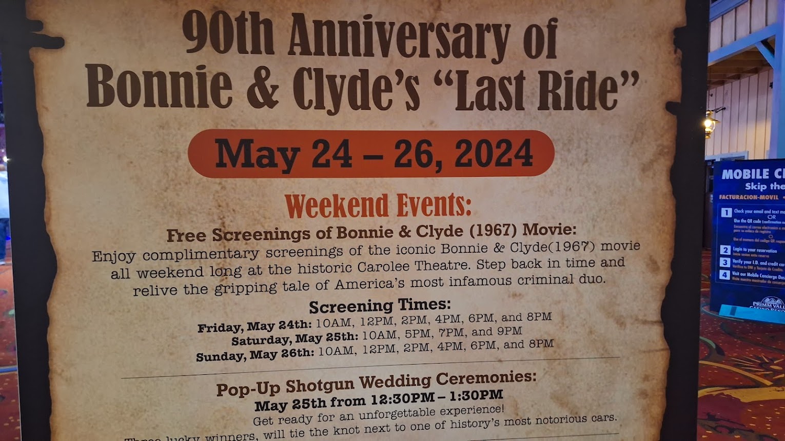 Free Screenings of Bonnie & Clyde (1967) Movie: Enjoy complimentary screenings of the iconic Bonnie & Clyde (1967) movie all weekend long at the historic Carolee Theatre. Step back in time and relive the gripping tale of America's most infamous criminal duo. Screening Times: Friday, May 24th: 10AM, 12PM, 2PM, 4PM, 6PM, and 8PM Saturday, May 25th: 10AM, 5PM, 7PM, and 9PM Sunday, May 26th: 10AM, 12PM, 2PM, 4PM, 6PM, and 8PM