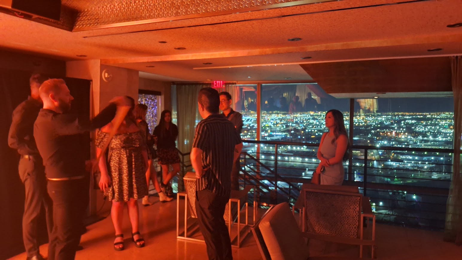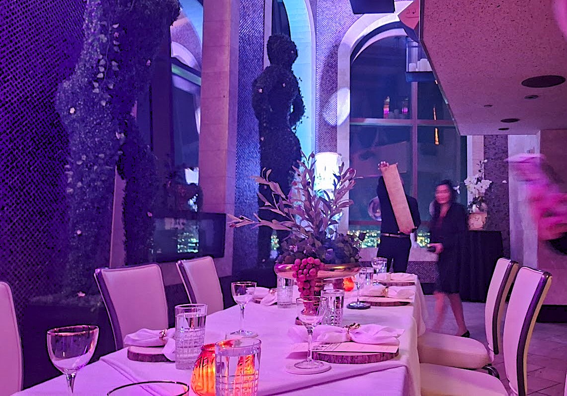 A pre-dinner cocktail hour encourages participants to become acquainted, enjoy a themed libation, and drink in the glory of the famed Las Vegas Strip. The lounge and dining room are adorned with grape leaves, billowing drapes, candles, and a curated sonic atmosphere.